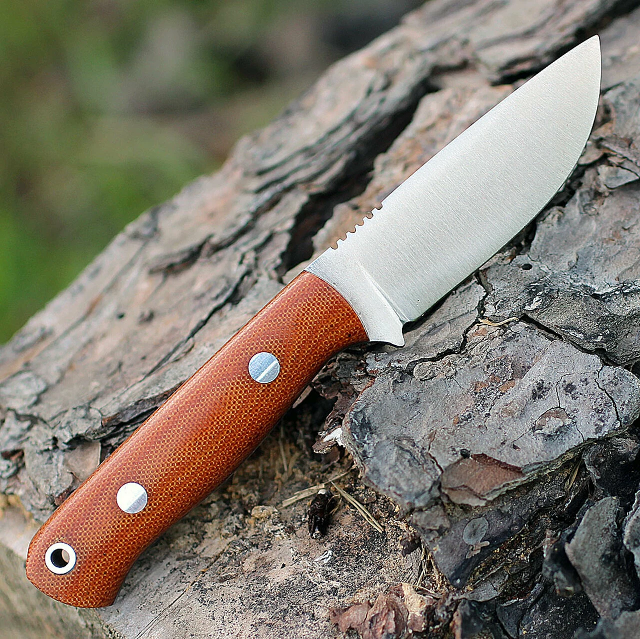 The smallest of the Bark River Bravo line, the Micro keeps to the feel of it’s larger brothers while taking on the tasks larger knives might struggle at. The convex ground drop point blade with spine jimping is perfect for food prep, processing small game and light camp tasks. Contoured black micarta handles with pinned construction provides a surprisingly good grip for a knife of this size. Easy throw this in your pack or cargo pocket with the included leather sheath.