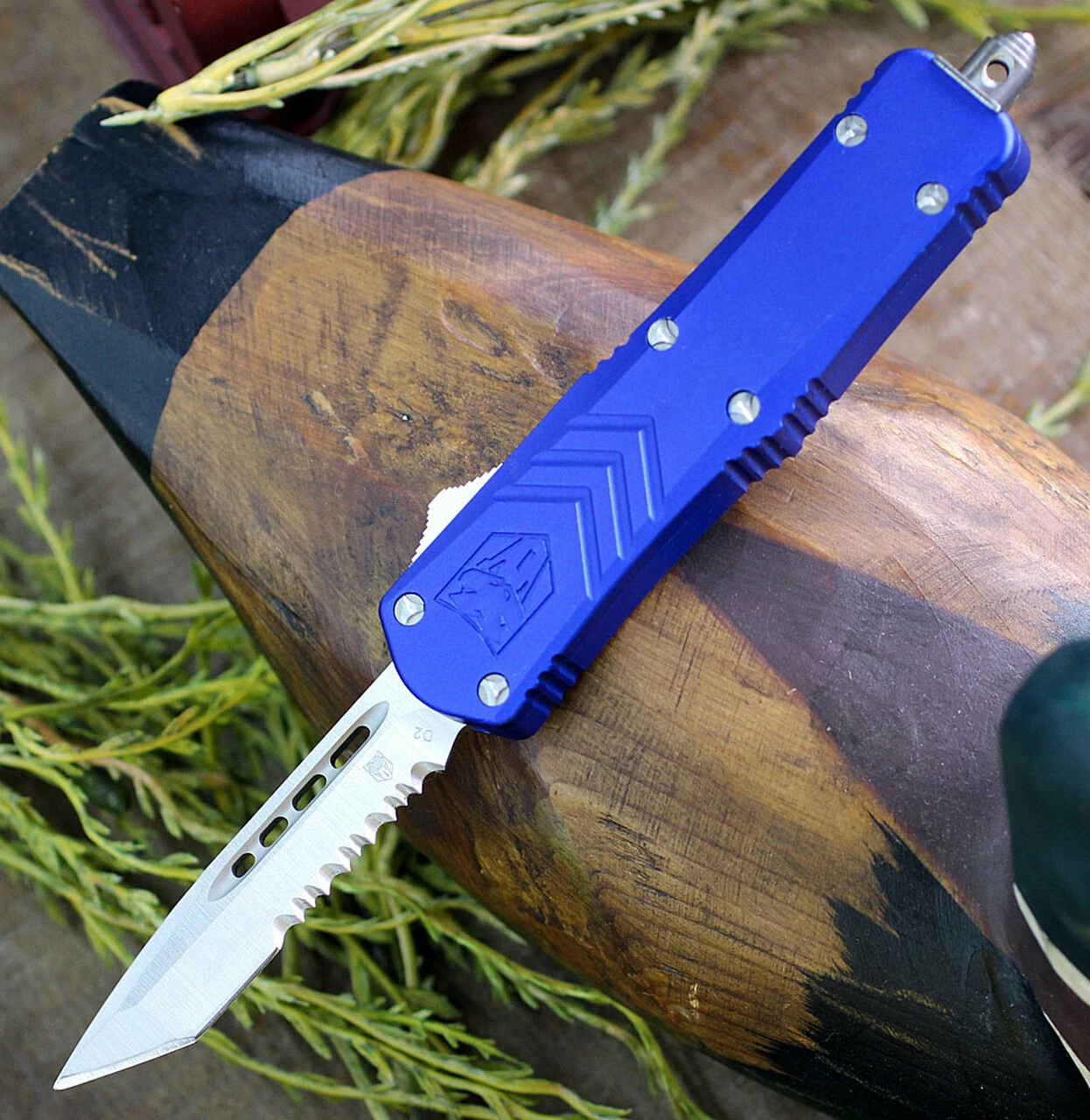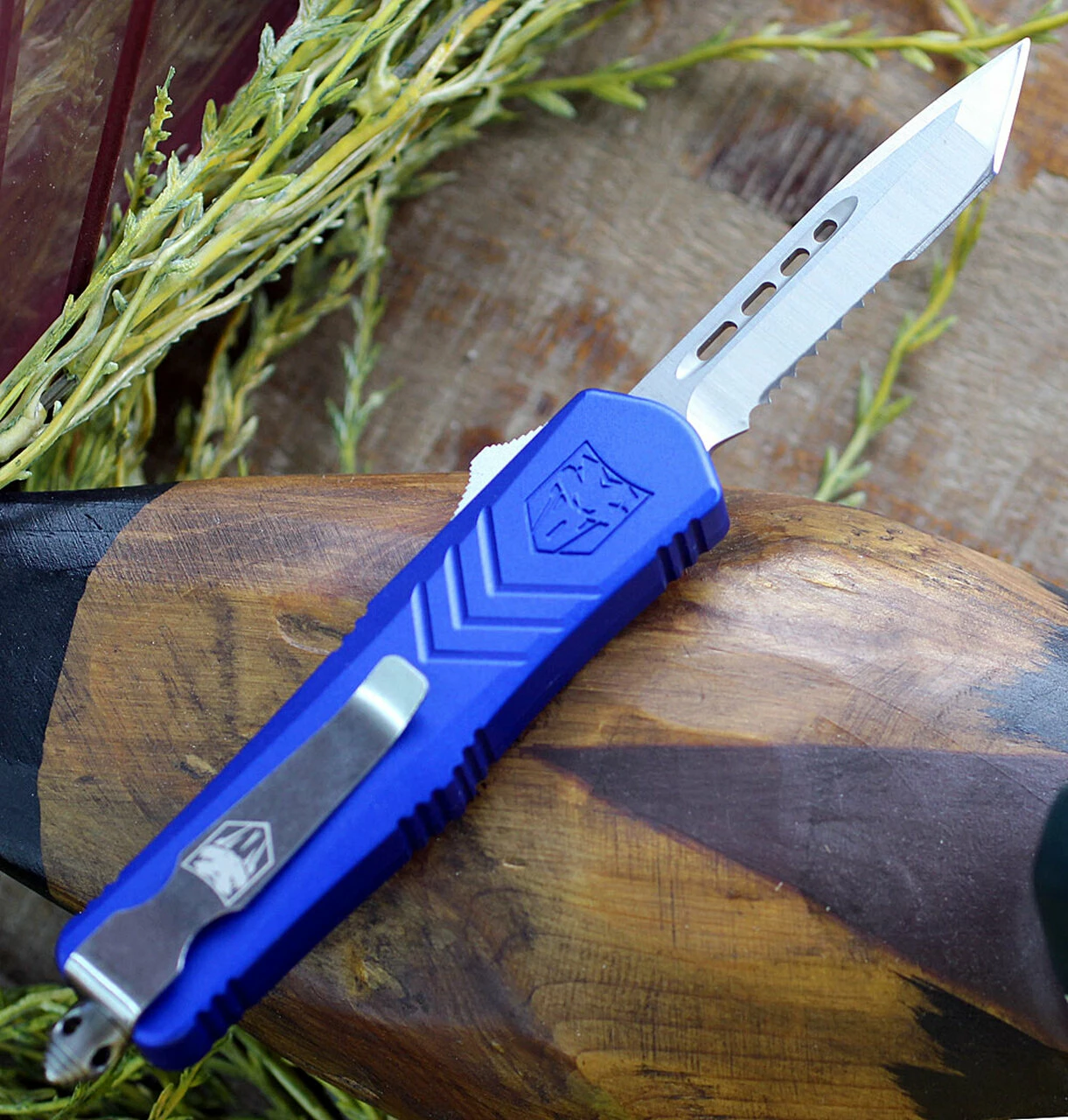 CobraTec Blue FS-X OTF Knife CTKSBLUFS-XSTS, 2.75″ D2 STeel Serrated Tanto Blade, Blue Aluminum Handle