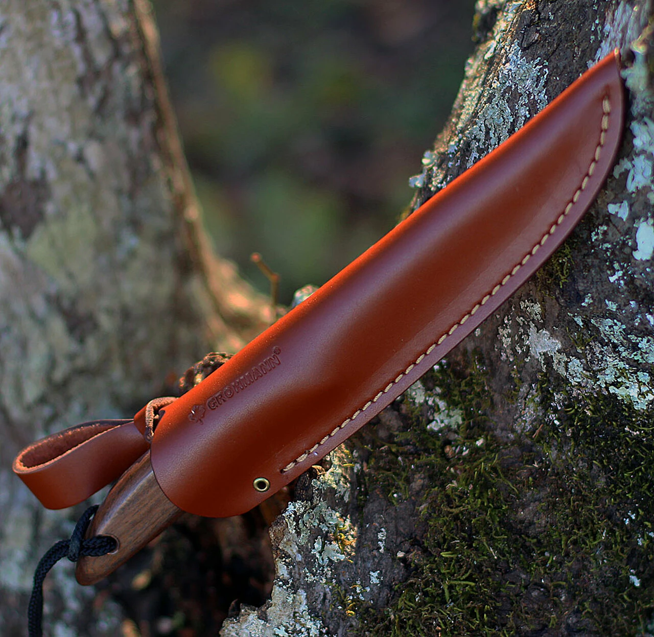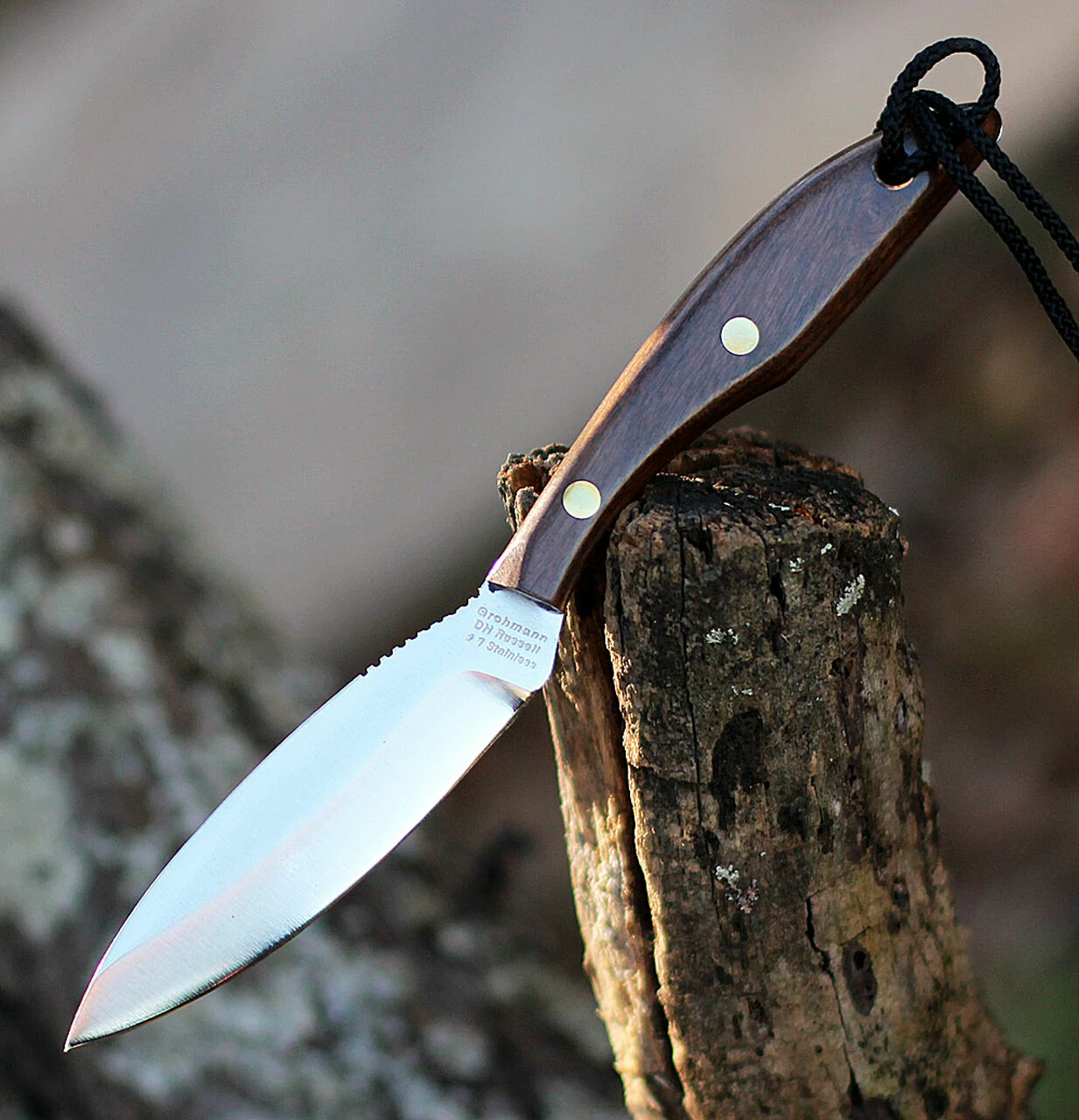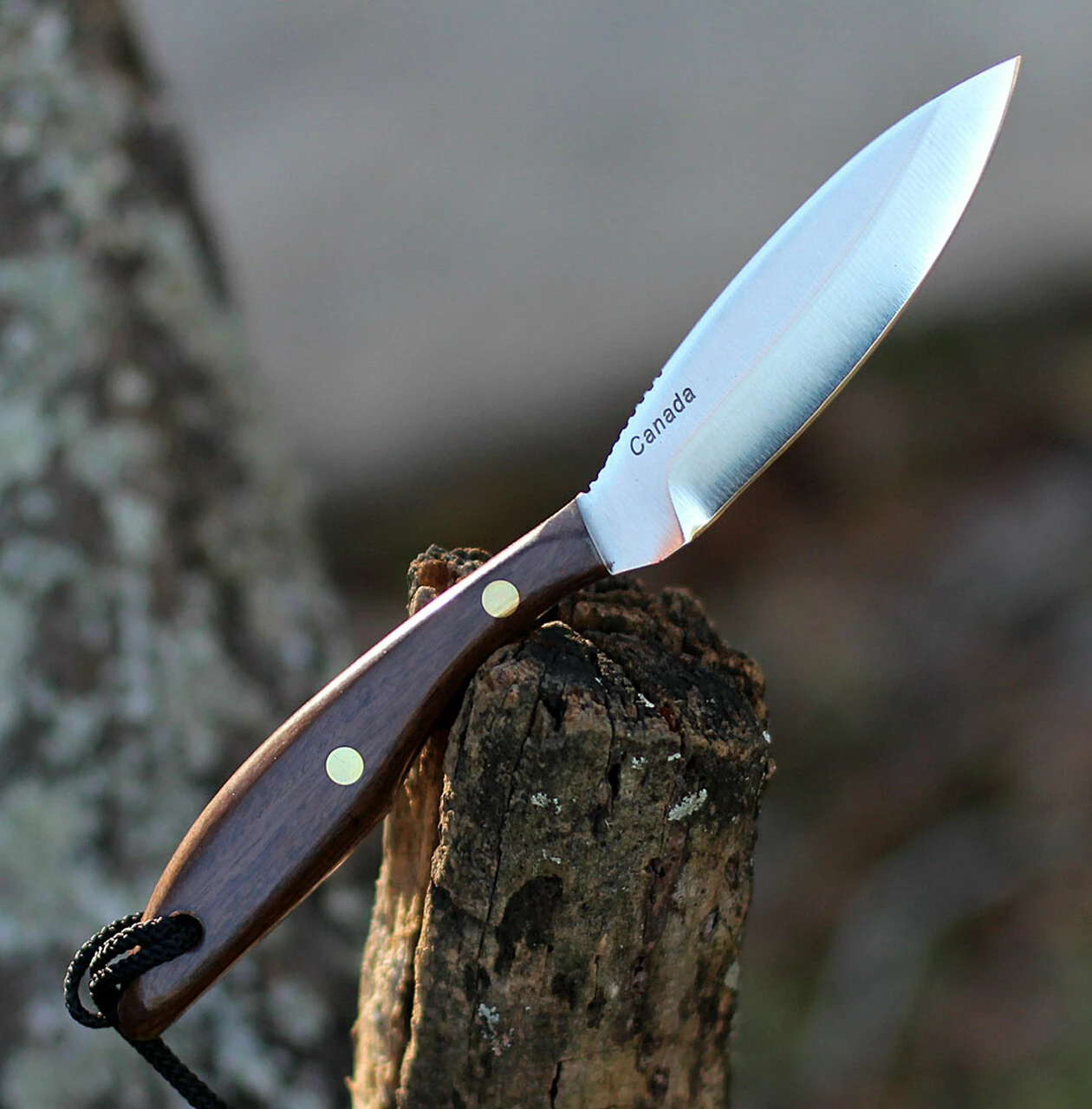 Grohmann Original Design. 8 1/2″ overall. 4″ stainless elliptical blade. Offset rosewood handles for safe grip. FUll tang. Lanyard. Leather belt sheath. Designed by D. H. Russell. Made in Nova Scotia.
