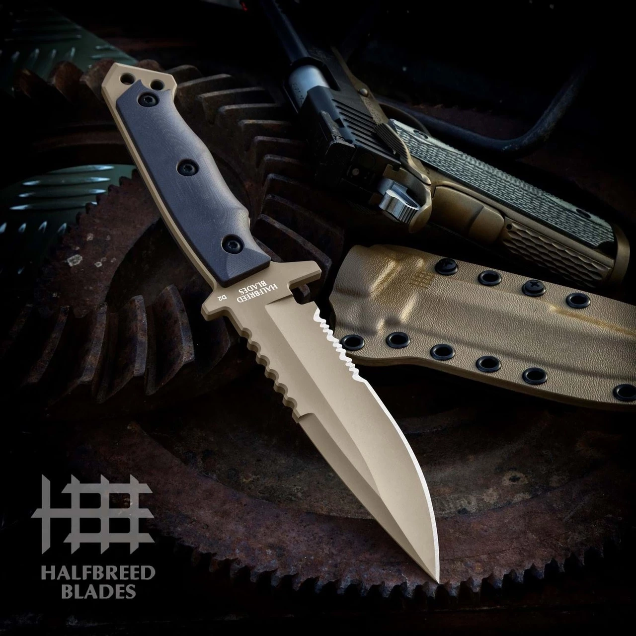 This Halfbreed large bush knife is made with K110 D2 steel blade. The medium infantry knife features a 5.31″ teflon coated partially serrated drop point blade with a dark earth G-10 handle and a kydex sheath.