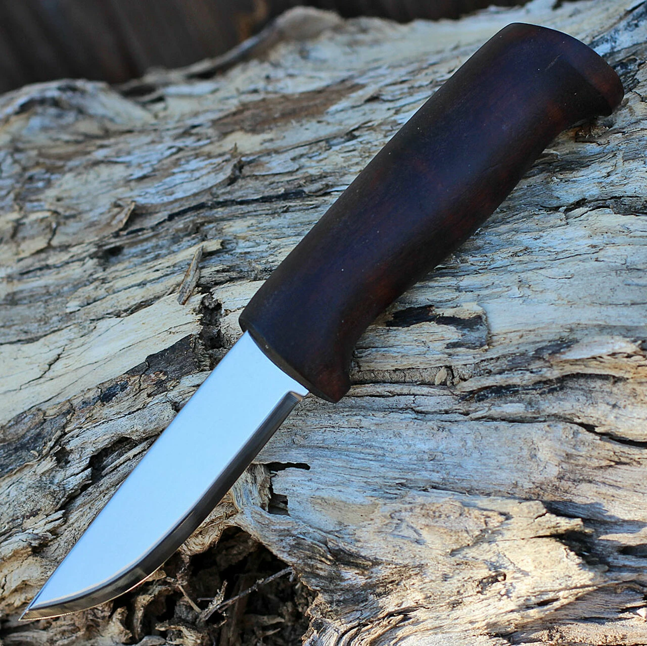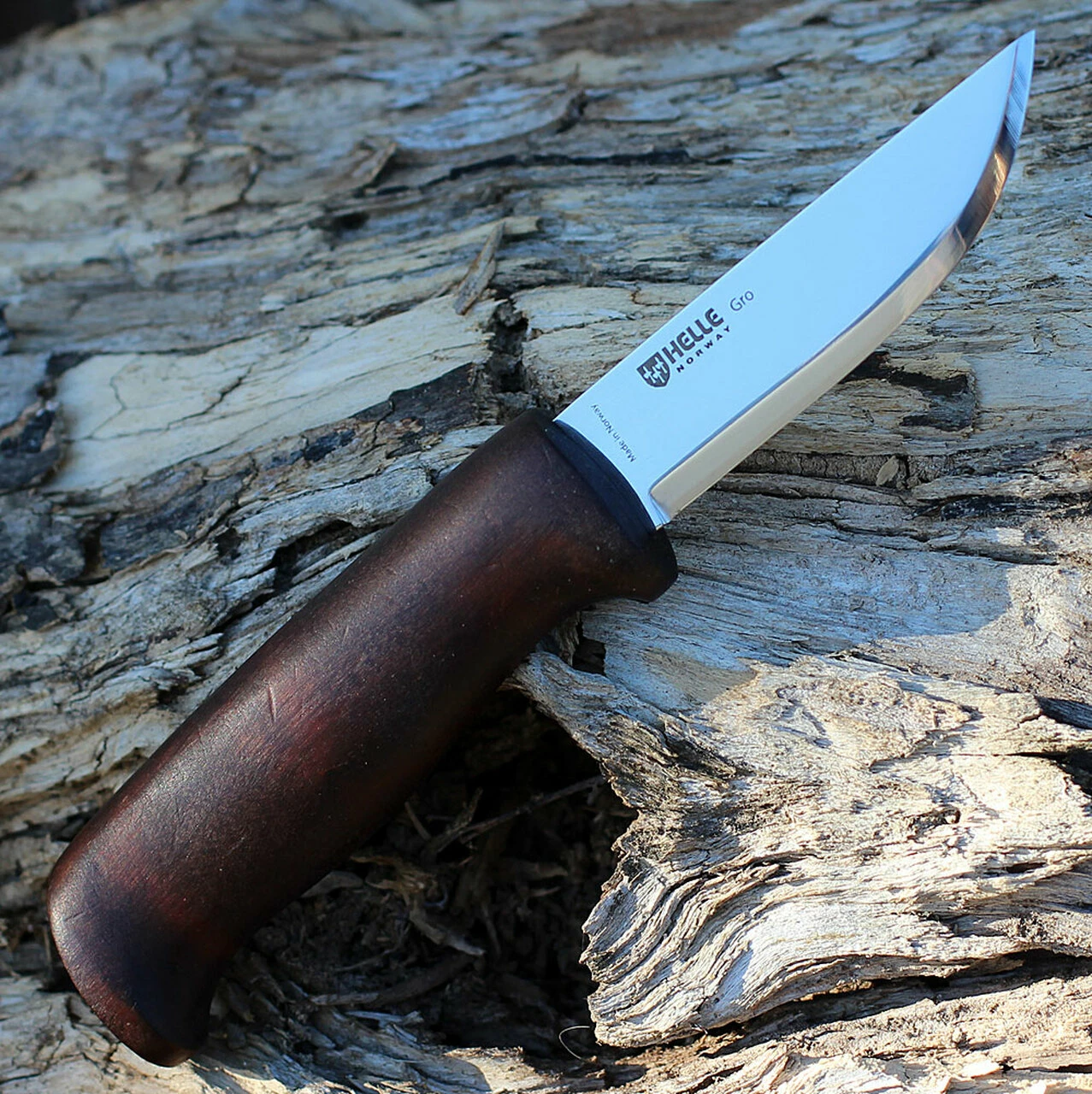 Helle Knives Gro Fixed Blade – 3.5″ Sandvik 12C27 Satin Drop Point Blade, Dark Birch Wood Handle, Natural Colored Leather Sheath