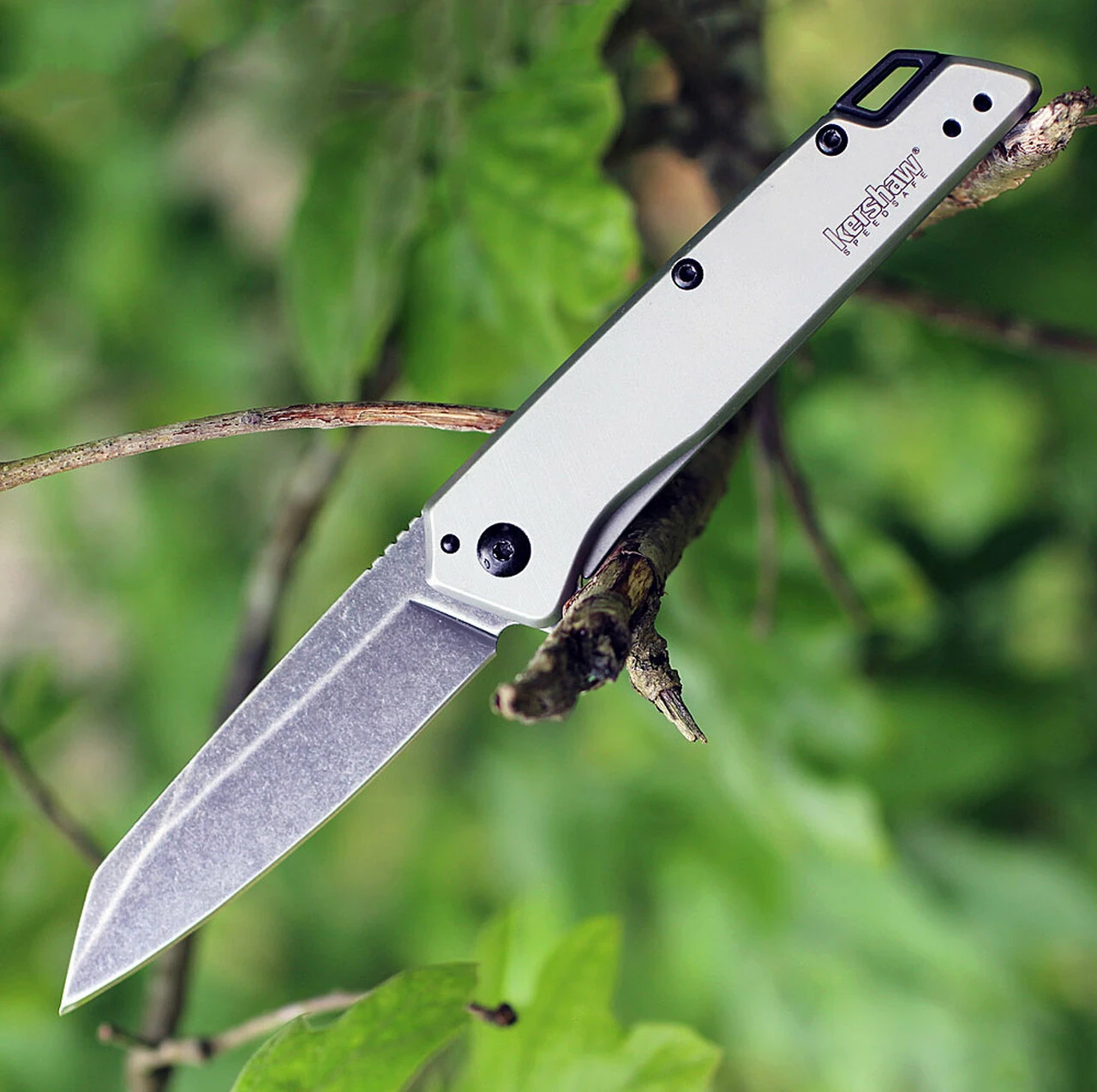 Kershaw 1365 Misdirect, 2.9″ 4Cr13 Blackwash Plain Blade, Stonewash Stainless Steel Handle