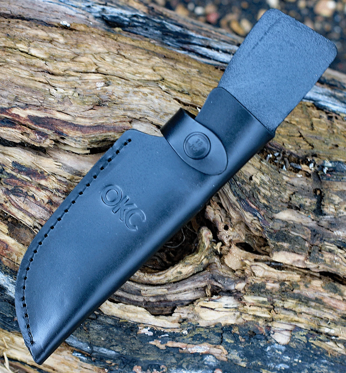 The OKC TAK 2 fixed blade knife will stand the test of durability. This knife has a full-tang 1075 high carbon steel blade with a black zinc phosphate finish. It features stabilized hardwood scales with three torx screws that secure them in place. Comes with a lanyard hole and a black leather sheath.