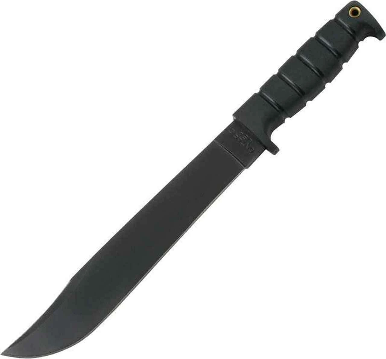 - 15″ overall 9 3/4″ 1095 carbon steel blade with black epoxy powder coat finish Black grooved Kraton handle with integrated finger guard and black cord lanyard Black nylon belt sheath with hardshell liner Weight: 1.5lbs Country of Origin: USA