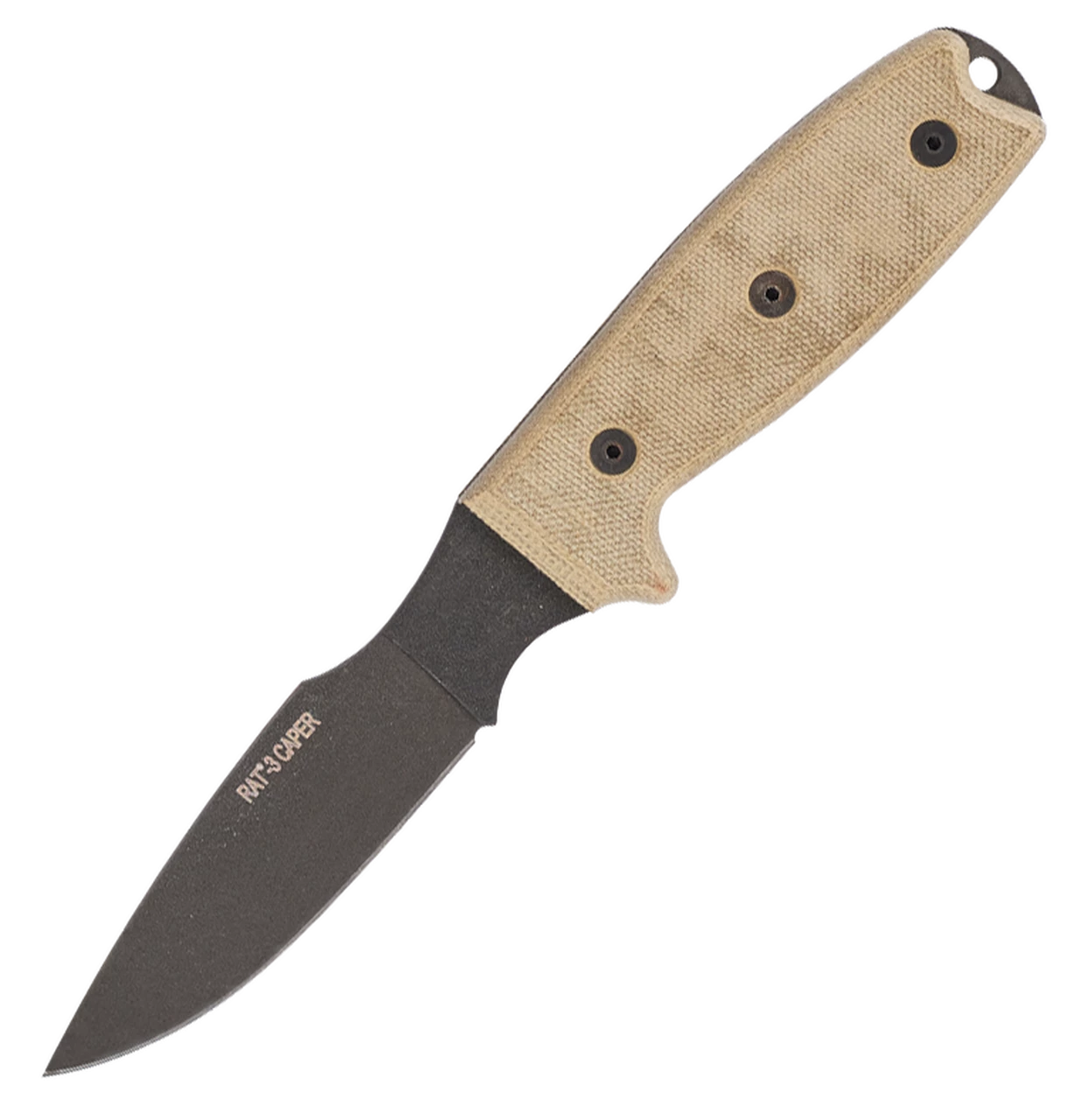 Ontario Rat-3 Caper (8663) – 3.00″ High Carbon Steel Black Drop Point Blade, Tan Micarta Handle w/ Leather Sheath