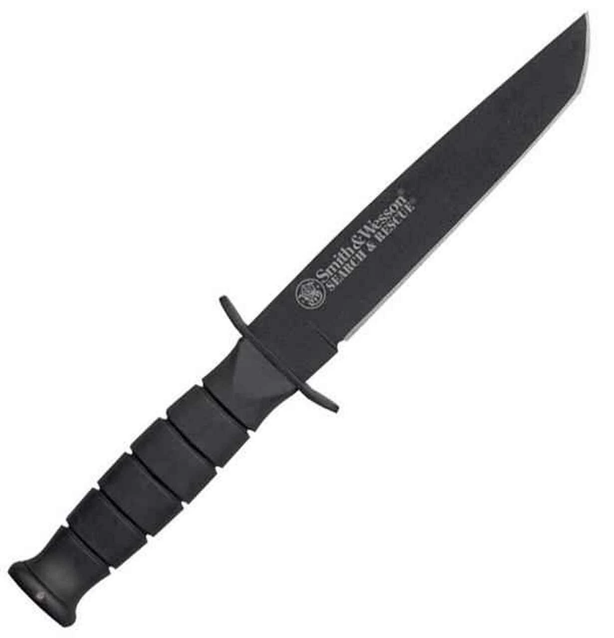 Smith & Wesson Search & Rescue Tanto. 10 1/2″ overall. 6″ black powder coated 440 stainless tanto blade with “Search & Rescue” and Smith & Wesson logo etching. Grooved black rubberized aluminum handle. Black finish guard and pommel. Heavy black Cordura belt sheath with hard shell liner and stone pocket.