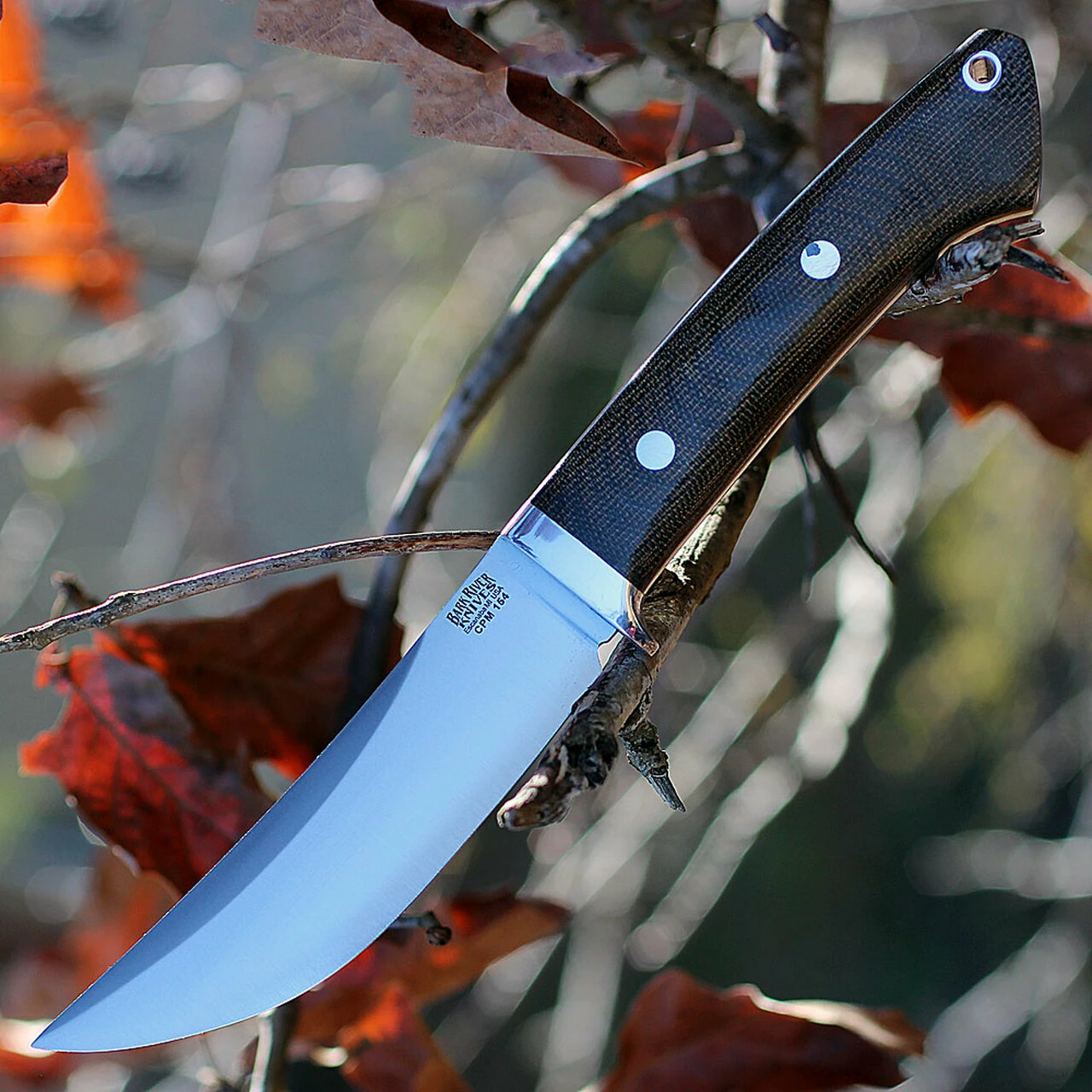 The new Bark River Trailing Point Hunter has the best features of the Classic Drop Point handle and our traditional trailing point blade. We made the blade a bit wider and longer than the drop hunter blade to maximize the slicing and skinning power of the knife. There is plenty of straight edge from the plunge line to do camp/bushcrafting and food prep chores. The knife is only 4.7 ounces so it is easy to carry on the belt or pack in your kit. The swedge grind thins the point for fine work. We think that this will be the ultimate upswept design for everyone that prefers this style blade.