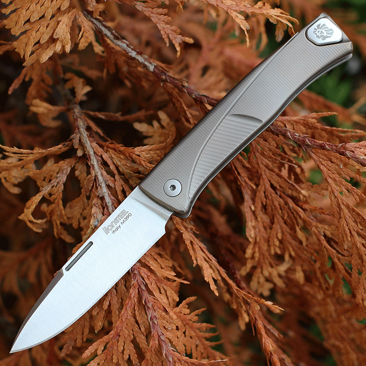 LionSteel Thrill Slip Joint (TL BR) – 3.15″ M390 Satin Drop Point Blade, Bronze Titanium Integral Handleย