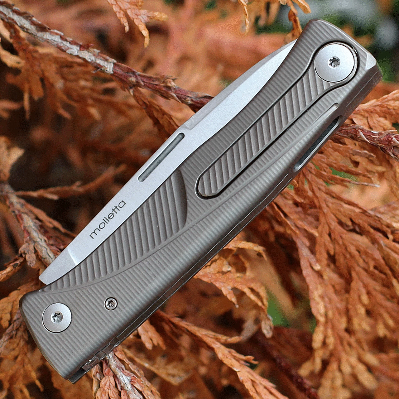 Thrill Titanium is theย SlipJointย knife with “no locks” mechanism andย HWAY.Lย – Hide What Annoys You system, which allows to hide the clip inside the handle when not in use. With the handle made out of a single titanium block with SOLIDยฎ Knife technology, Thrill Titanium features a M390 stainless steel blade with satin finish.