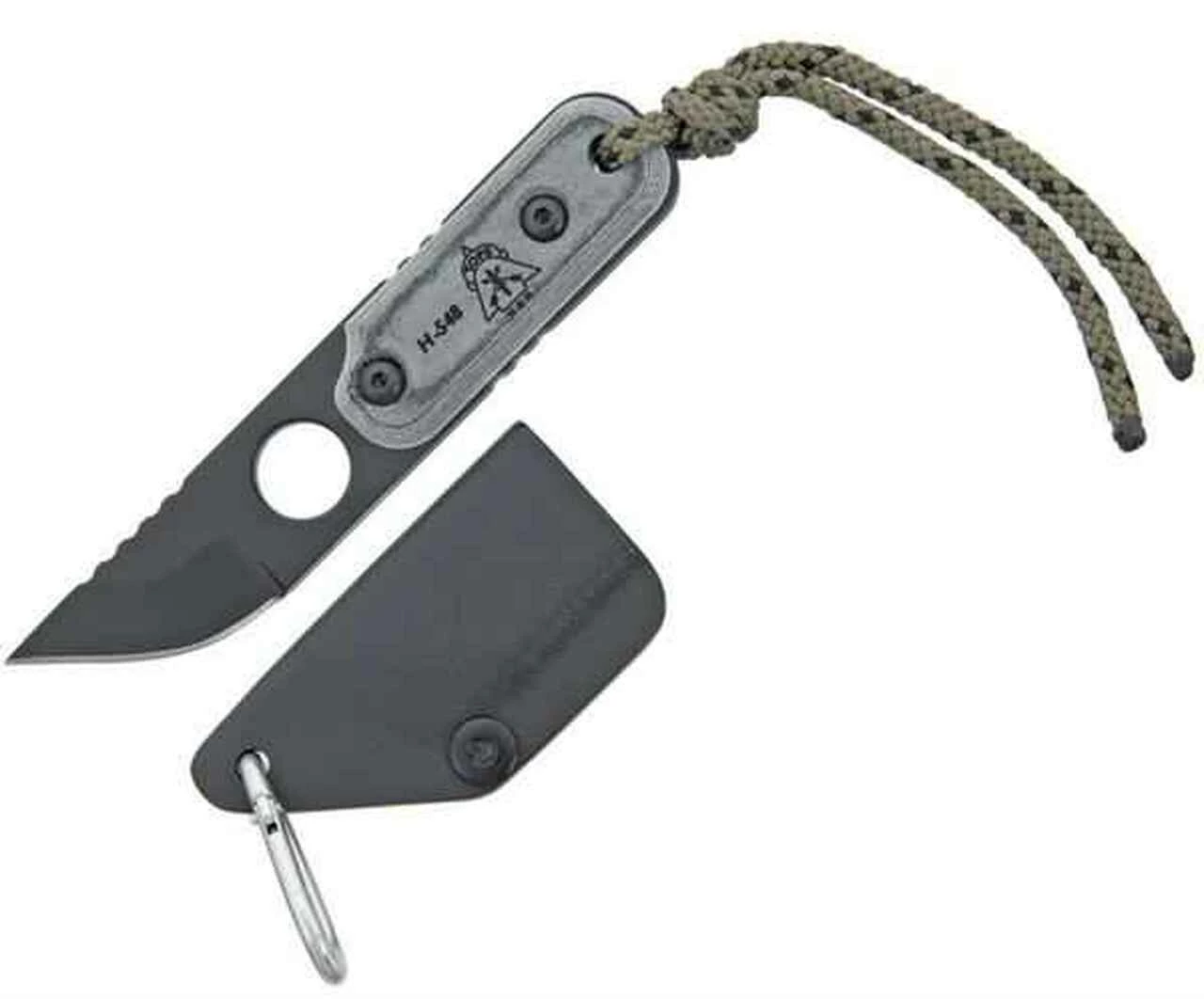 Full tang. Black micarta handles with lanyard Black Kydex sheath