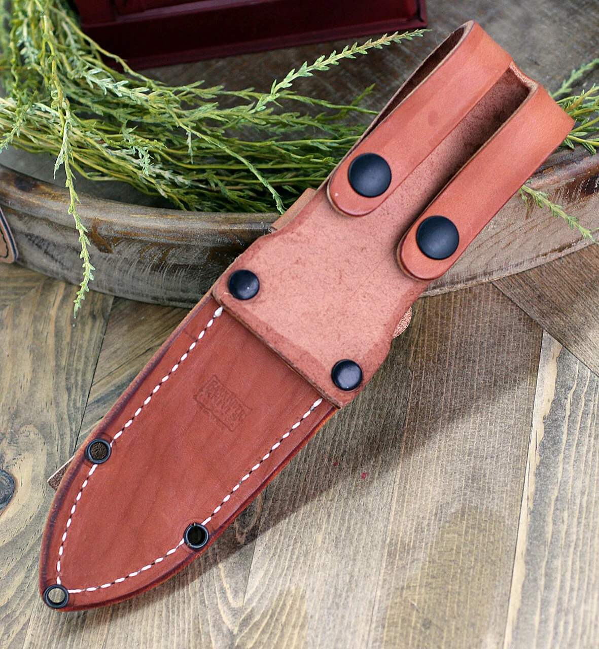It is supplied with a Right Hand Brown Bravo 1 Sheath. However, it can also be matched with a Bush Seax sheath.