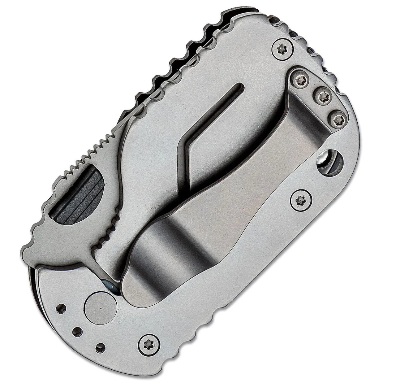 The Subcom folding knife has a municipal-friendly blade, at 1-7/8″ long and 1/16″ thick. The blade is beadblasted AUS-8 stainless steel and boasts an ambidextrous thumb stud. The reversible pocket clip and compact size of this framelock knife make for an ideal money clip. Both thumb and palm index ramps provide for a secure grip. Handle is fiberglass reinforced nylon.