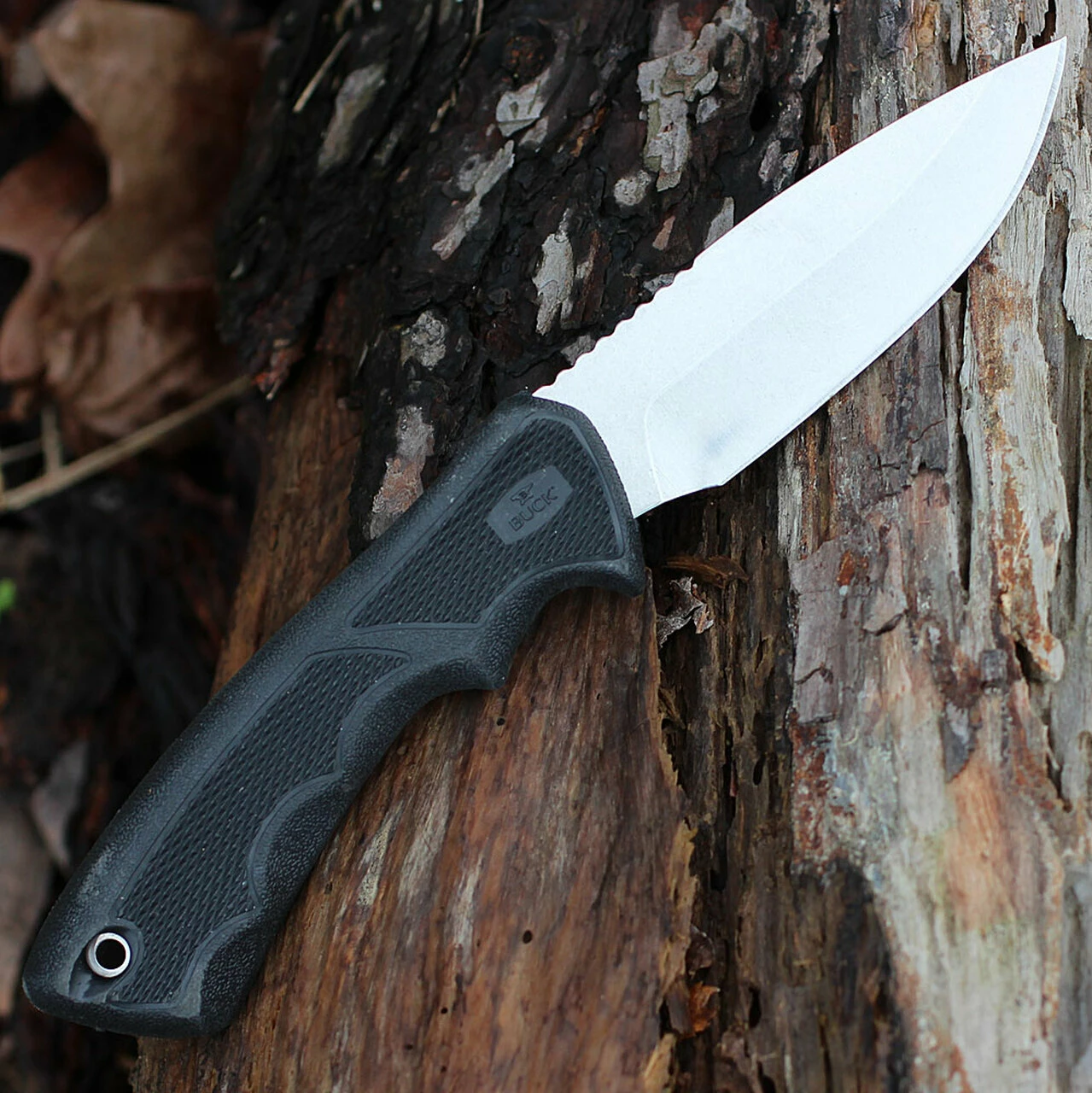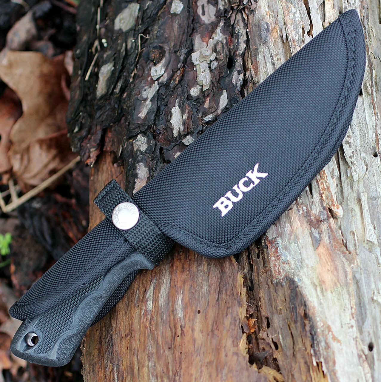 With your choice of a standard drop point blade or guthook, the large BuckLite Max II is a knife for every hunter. The full tang, ergonomic handle is constructed out of Dynaflex® rubber for superior grip, performance, and light weight. The drop point blade has been tumbled finished, for a less porous, improved corrosion resistance. Buck’s advanced Edge2x blade technology has been applied to the blade resulting in insane sharpness out of the box. Comes with a heavy-duty, black polyester sheath.