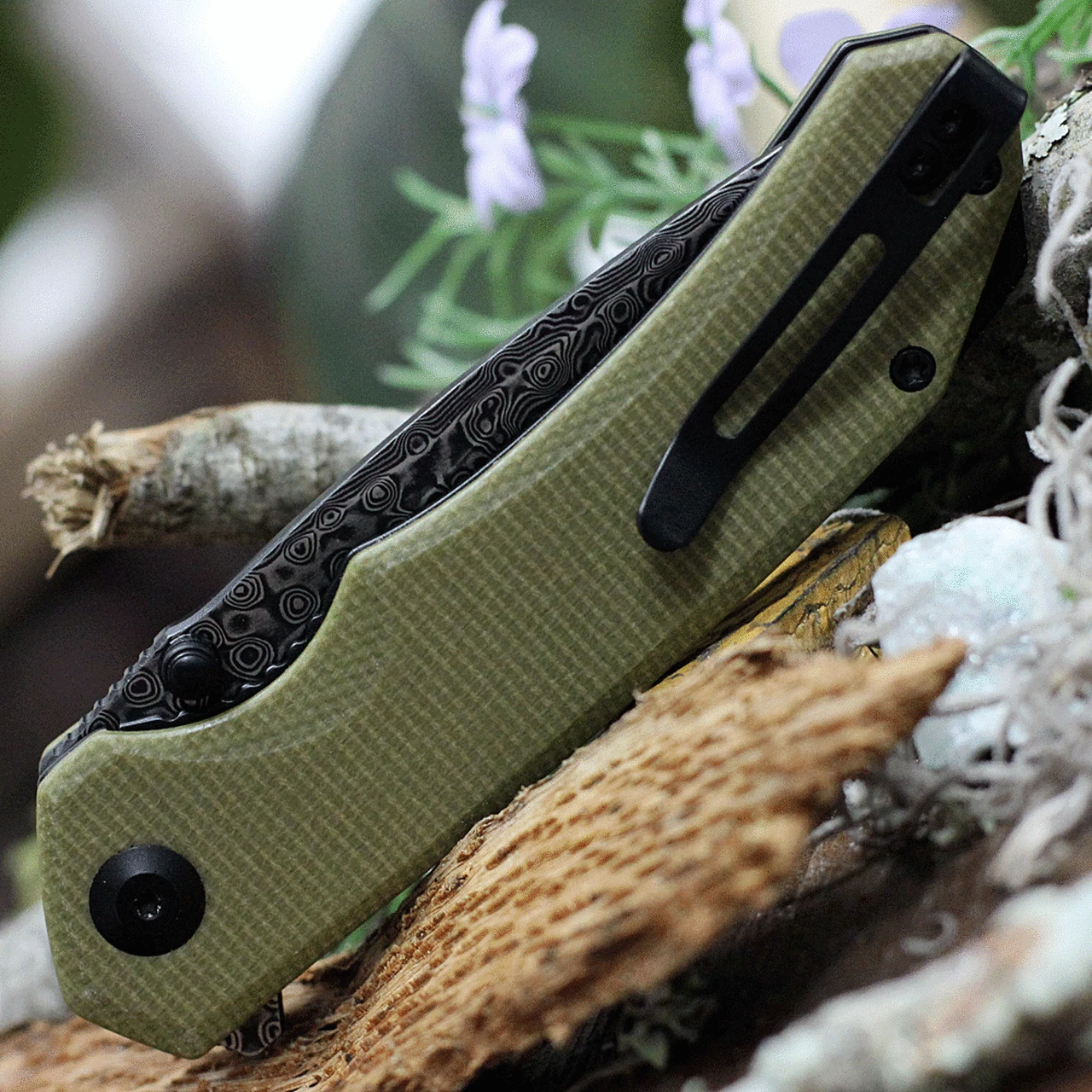 CIVIVI Brazen Flipper Knife C2102DS-2, 3.46″ Damascus Blade, Olive Micarta Handle