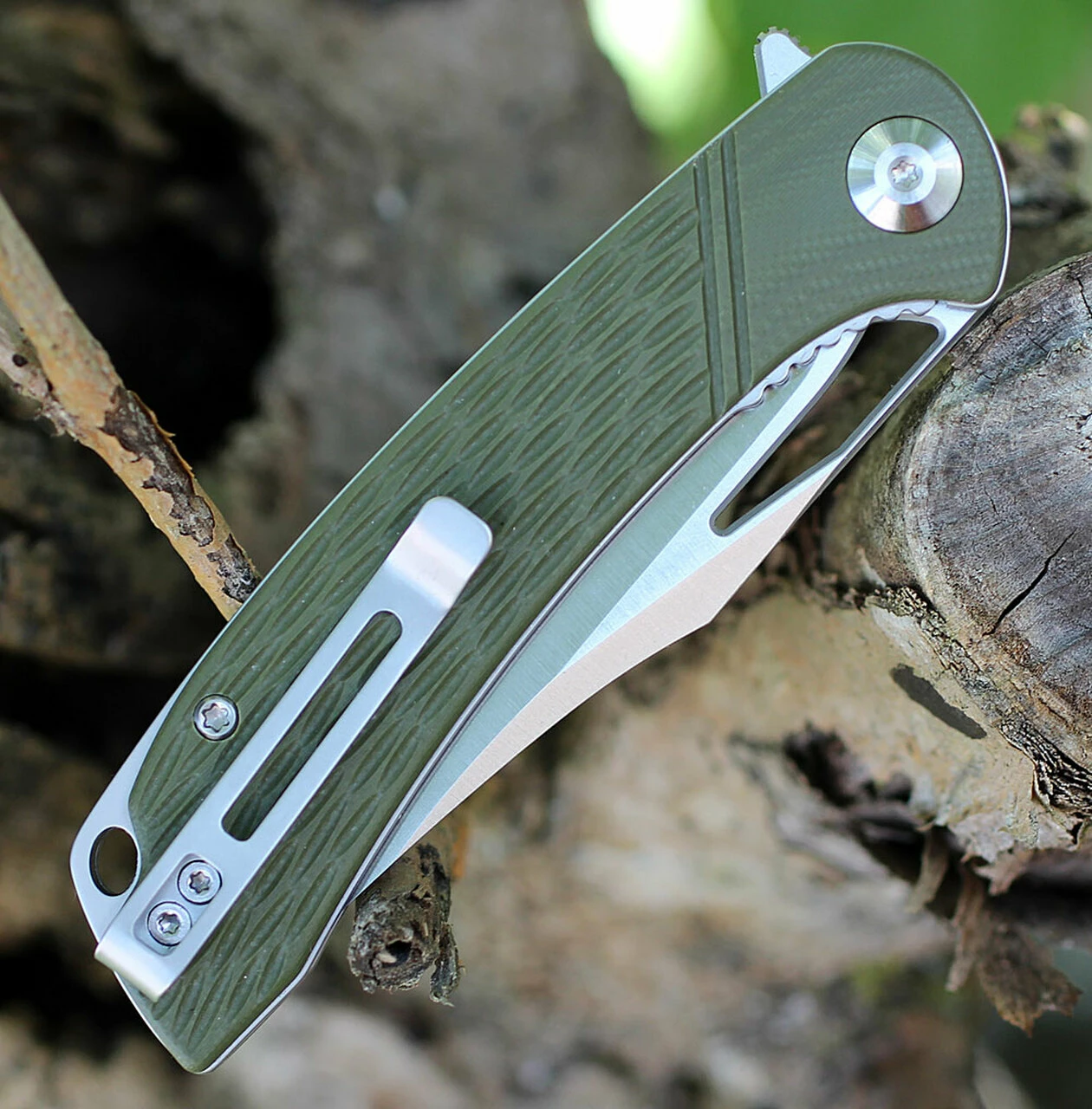 The CIVIVI Dogma is a stylish and sleek designed knife that is perfect for your everyday carry uses. Of course with it being a CIVIVI, the action is smooth and reliable. The blade has a Bowie shape with with a finger choil for choking up on. This blade pairs excellently with the OD green G-10 handle which is textured for good grip. It has stainless steel liners to give this sleek design strength and allow for a lanyard hole at the butt end. It also features a reversible pocket clip.
