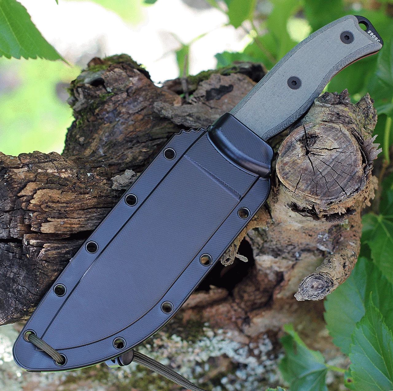 The ESEE-6P-CP fixed blade knife features grey linen Micarta scales and a black finished blade with a plain cutting edge and sharpened upper edge. Includes an black molded sheath, clip plate, paracord and cord lock