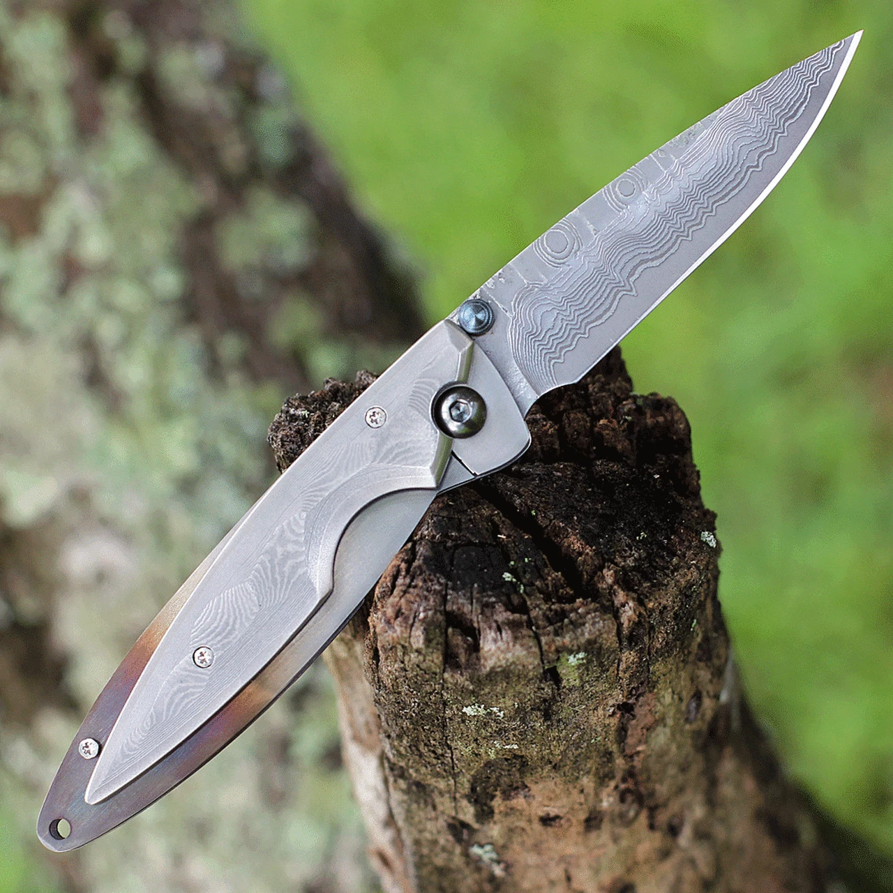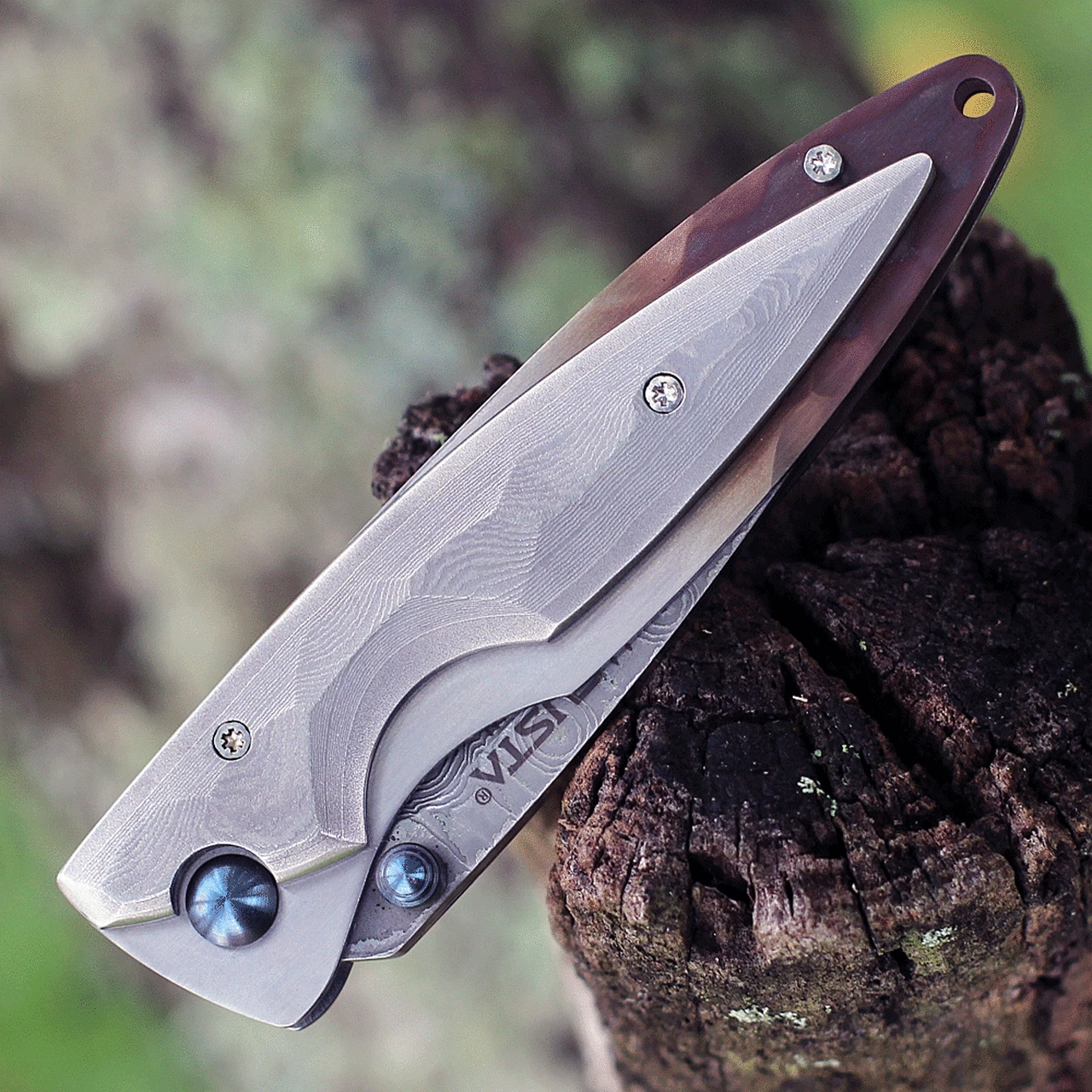 Mcusta Kusumi Classic Damascus Folder. 3 1/2″ closed linerlock. VG-10 stainless core forged with 33 layer nickel damascus blade (RC 59-50) with ambidextrous thumb studs. Solid damascus handles with anodized pivot pin. Features a specially designed Teflon washer system for silky smooth action. Comes in a decorative woven nishijin pouch.