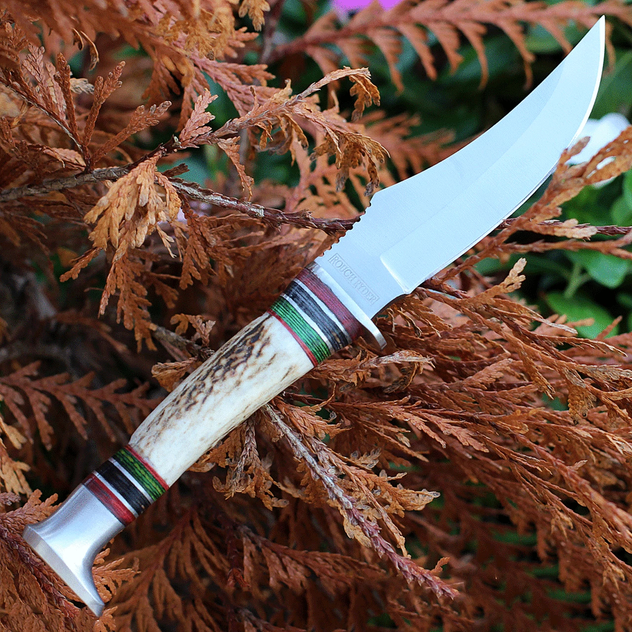 Stag Skinner by Rough Ryder. 9.5″ overall, 5″ stainless steel clip point blade with satin finish and genuine stag antler handles. Includes brown leather sheath with belt loop.