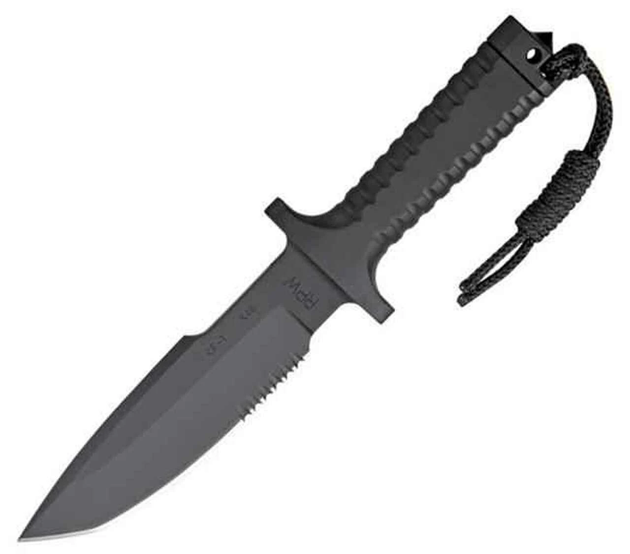 This integral knife is all Armor black CeraKote finish with a fluted handle for no slip grip and a drop point blade with a false top edge. Makers mark and serial number stamped on blade (serial number may differ from knife pictured). Includes original box and paperwork with a letter of authenticity and a “Spec Ops Combat Master” nylon sheath. These knives are some of the first 45 made in this production and have a case hardened butt cap with a conical glass breaker. This is an upgrade for any knife made after the first 45. Brand new from maker.
