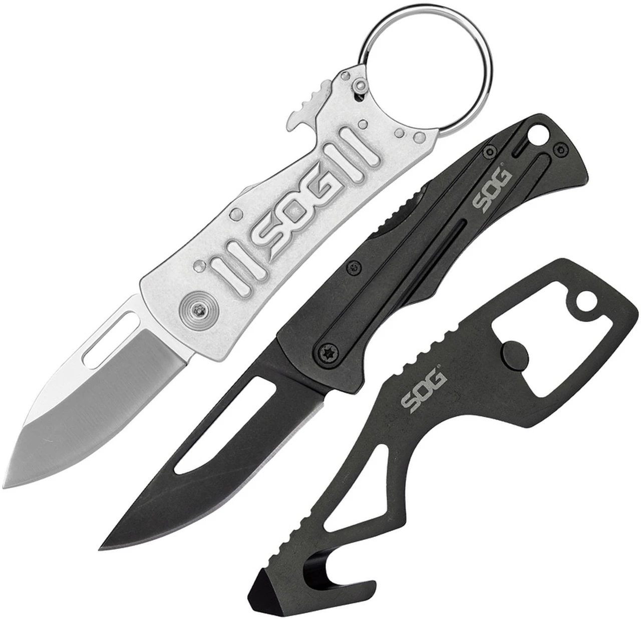 This SOG Pro 2.0 Kit contains 3 items designed for easy EDC carry. The keychain knife clips easily to a keyring or belt loop for quick access. The folding knife is a small lightweight item that fits easily and unobtrusively into a pocket. The flat tool features a flat head screwdriver, a line cutter, and a bottle opener to give you the ability to handle a variety of tasks.
