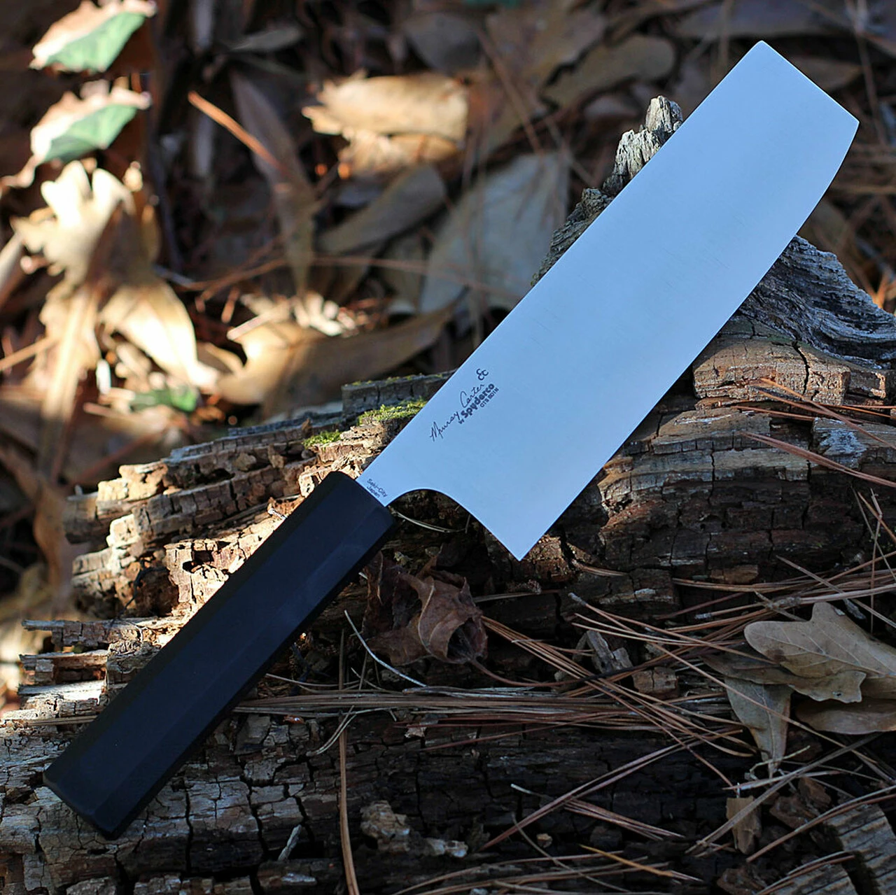 Meaning “vegetable cutter,” this knife’s unique rectangular shape and slightly upturned edge make it the perfect tool for precisely push-cutting all kinds of vegetables. The Nakiri’s blade shape also allows its length to remain consistent after years of sharpening.