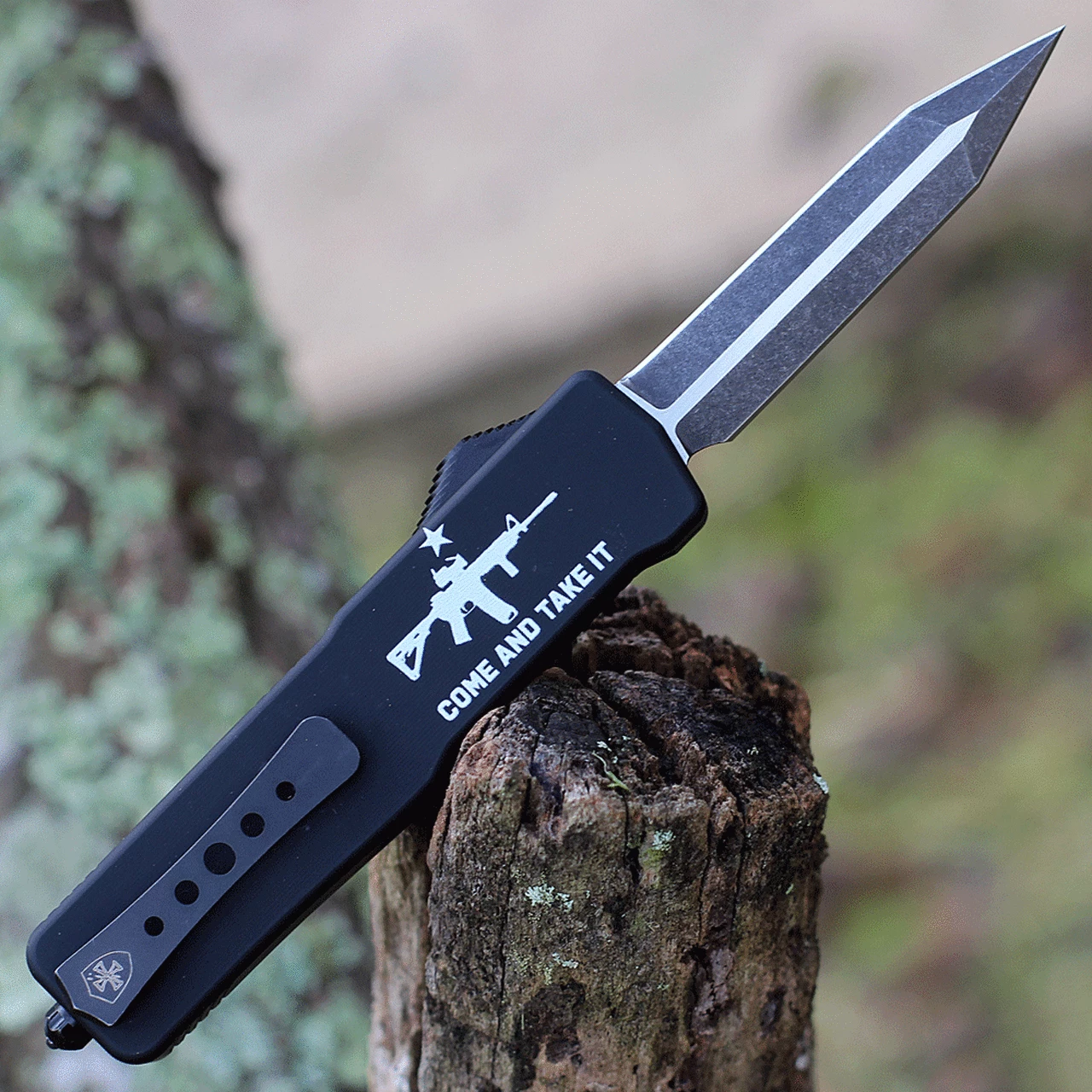 Templar Knife Premium Lightweight Series – Small OTF Automatic (SA-AR15-12-1) – 3″ Powder D2 Black SW Dagger, Aluminum “Come And Take It” W/ AR15 Handle