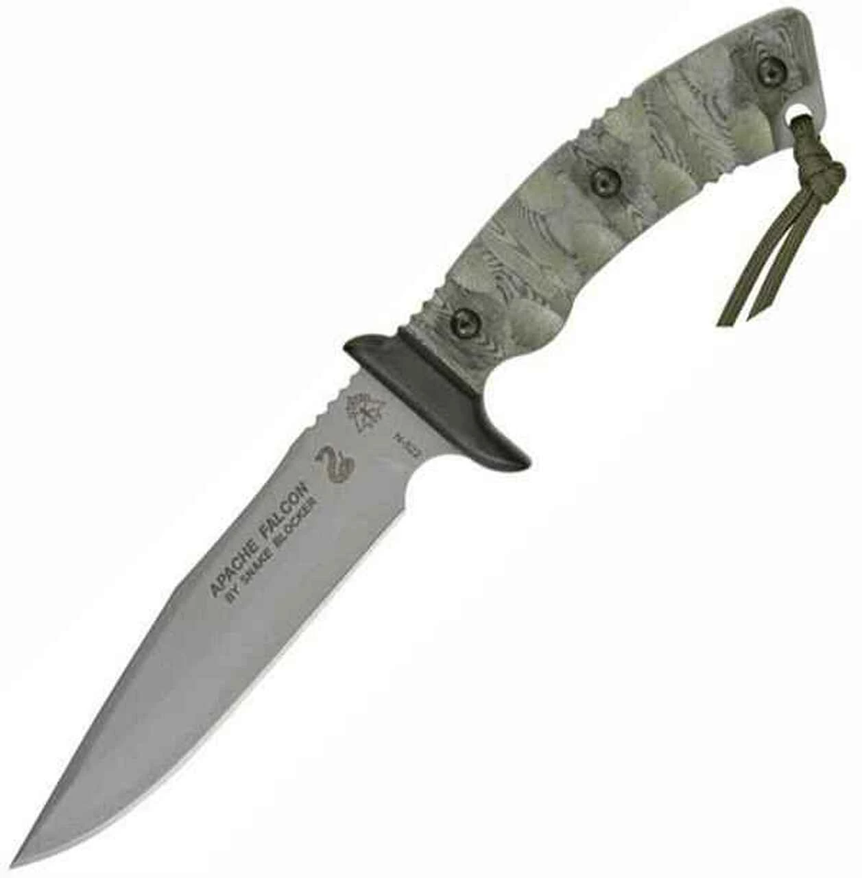 Tops Apache Falcon. 12″ overall. 6 1/4″ 1095 high carbon steel blade with bead blast finish. Full tang. Black linen micarta handles with Rocky Mountain tread grip. Lanyard. Black ballistic nylon belt sheath with Kydex liner and lanyard.