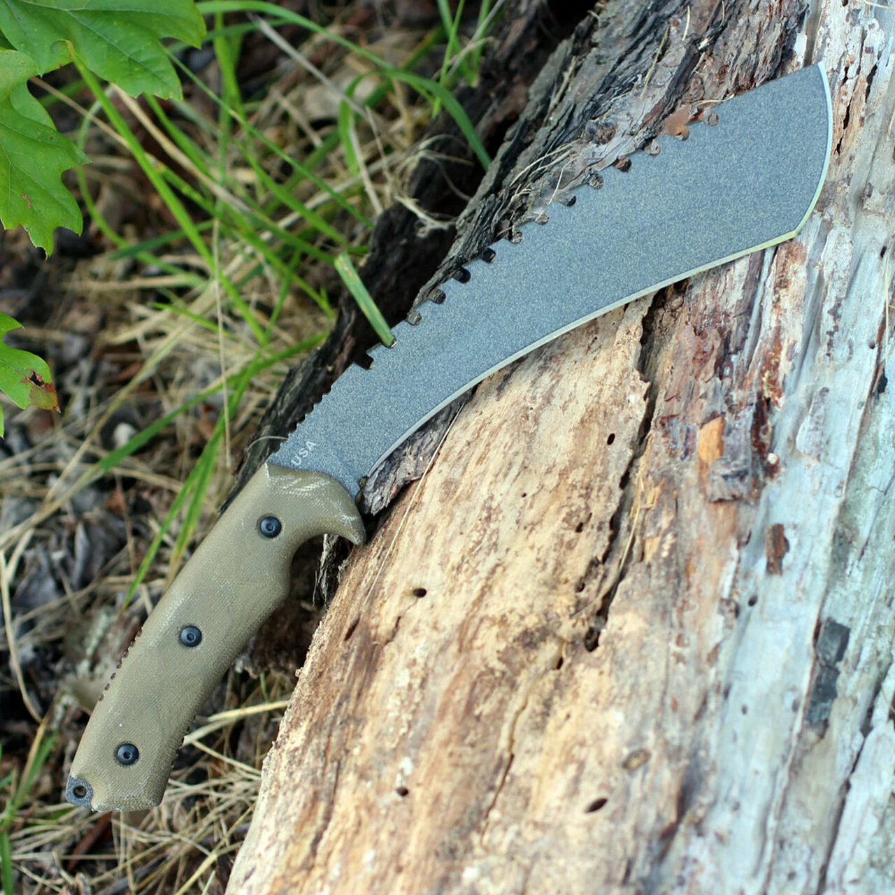 It is thinner and lighter than traditional kukris aside from the obvious fact that the blade style and saw teeth are also not something you’d see on a traditional kukri. Yet this 9″ blade made with a 3/16″ 1095 stock will be an excellent cutter in the field. The nicely rounded Micarta handles are long to provide more than one grip option for different cutting tasks. It has our opposing pitch saw teeth on the top so that users can quickly and cleanly make notches in wood when setting up camp or for certain survival tasks.