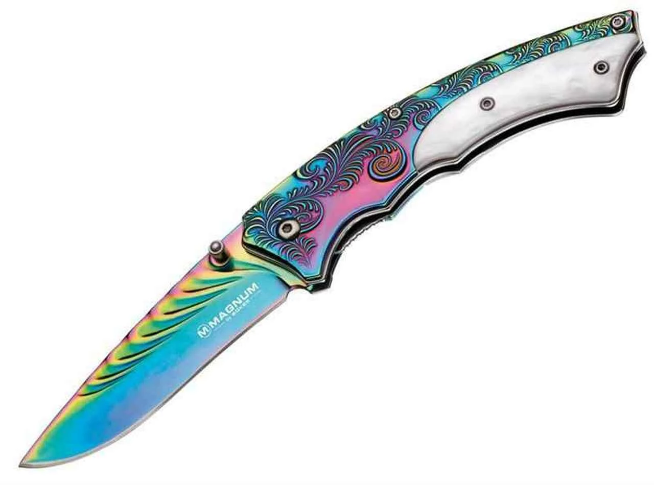 The Boker Magnum Pearl Rainbow Folder has a 440 stainless steel blade which features a rainbow finish, and a wavy pattern for added style. The rainbow handle features an attractive scroll pattern, and contrasts nicely with the mother-of-pearl inlays