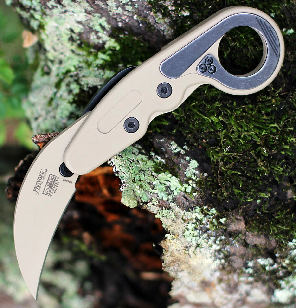 The powerful Provoke™ Desert Sand morphing karambit knife is a new iteration of an instant classic. Built with the inematic™ innovation, it transports covertly and comes to life when called in for duty. Crafted with D2 steel and finished ith Cerakote® for enhanced protection and a unique color, it’s poised to become a staple of standard issue.