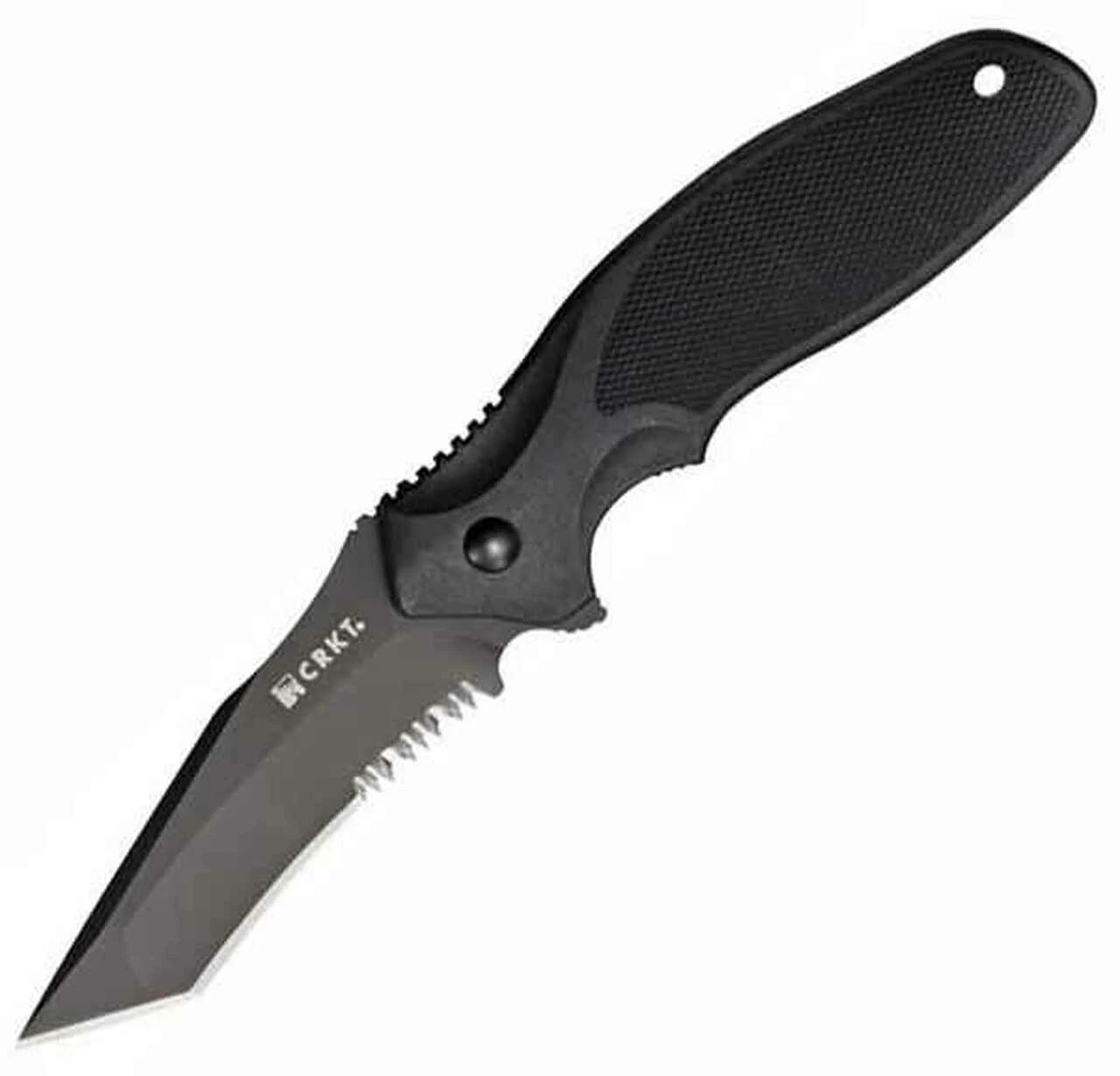 CRKT Shenanigan T Tactical. 4 7/8″ closed linerlock. 3 1/4″ AUS-8 stainless partially serrated modified tanto blade with black titanium nitride coating and flipper. Checkered black molded glass filled nylon handles. Lanyard hole. Removable black finish stainless pocket clip.