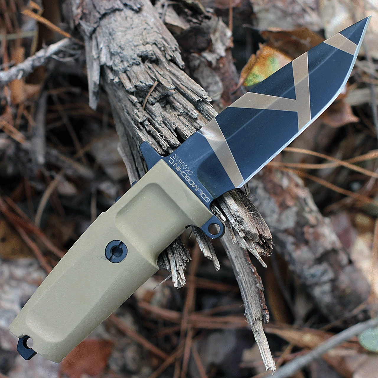 The 4.25″ Bohler N690 stainless steel hollow ground blade with large swedge is an excellent close combat tool. Comfortable tan Forprene handle ensures a sure grip in hand. Includes tan molded polymer sheath with Tek-lok for versatilecarry options.