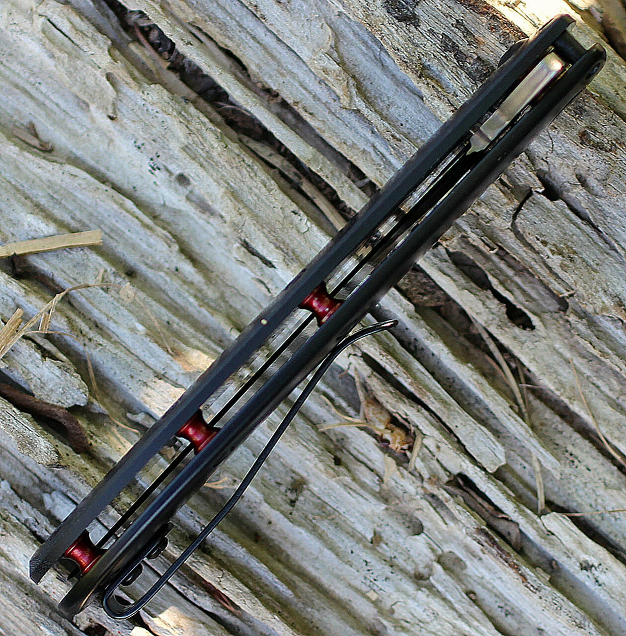 The AM-4 features SpeedSafe assisted opening for quick and simple one-handed opening. Just pull back on the flipper or push on the thumbstud. The blade is quality 8Cr13MoV stainless steel with a handsome satin finish and a top swedge. The front handle scale is G-10—crowned and polished for a smooth feel and classy look. The back is pure steel with a sturdy frame lock to keep the blade in position until you release it. The AM-4 also features a deep-carry pocketclip with AL MAR™ KNIVEs’ red logo emblem and—for an extra measure of visual interest—we used red standoffs.