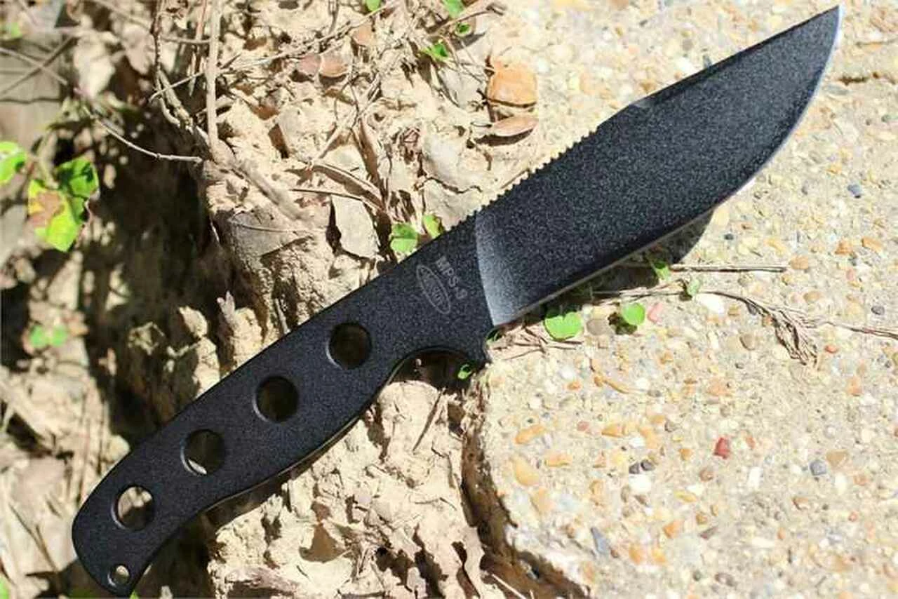 The MPS was designed with the input and suggestions of NAVAIR, U.S Marine Recon units, units of the Armys Special Operations Command, and various United States Special Operations personnel. The MPS slides easily into existing pilot survival knife sheaths. Many back packers, hikers, mountain climbers and campers have commented that the MPS is the perfect utility knife. The MPS-A2 is made using tool steel hardened to 58RC, providing exceptional toughness and avoiding the edge chip-out problems associated with steels fully hardened to 61RC+. The MPS blade is a smaller version of our MPK model with the same versatile blade belly which makes it an excellent utility and survival knife. The additional spine serrations on the MPS allow more thumb pressure, grip and control for delicate cutting tasks. This MPS-A2 is available in approximate 10 length, .187 thickness, black plain edge with a skeletonized handle and a Kydex sheath.