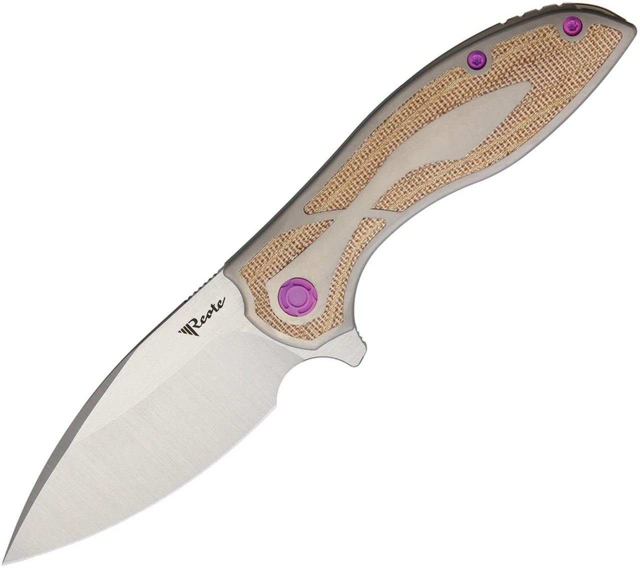 Reate Knives Iron Flipper Knife , 3.25″ M390 Satin Spear Point Blade, Titanium Handle with Brown Micarta Inlay, Purple Anodized Hardware