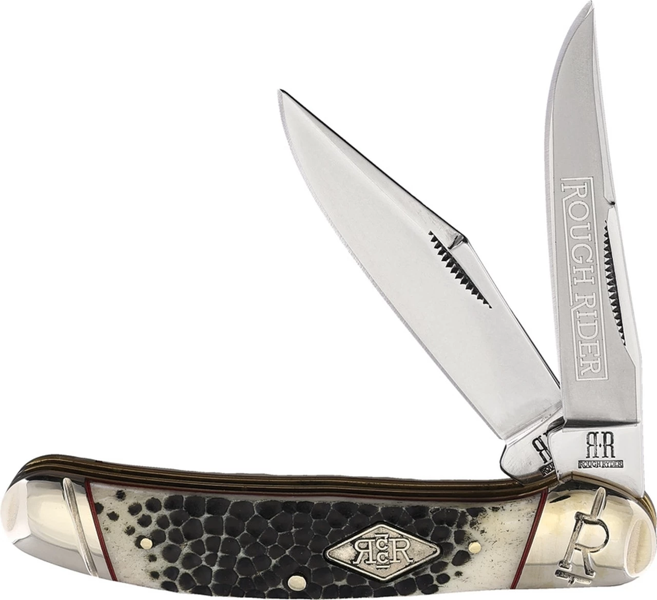 Rough Ryder Copperhead Buckshot (RR2323) – 2.5″ Stainless Steel Satin Clip Point and Skinning Blade, Black and Tan Buckshot Bone Handle