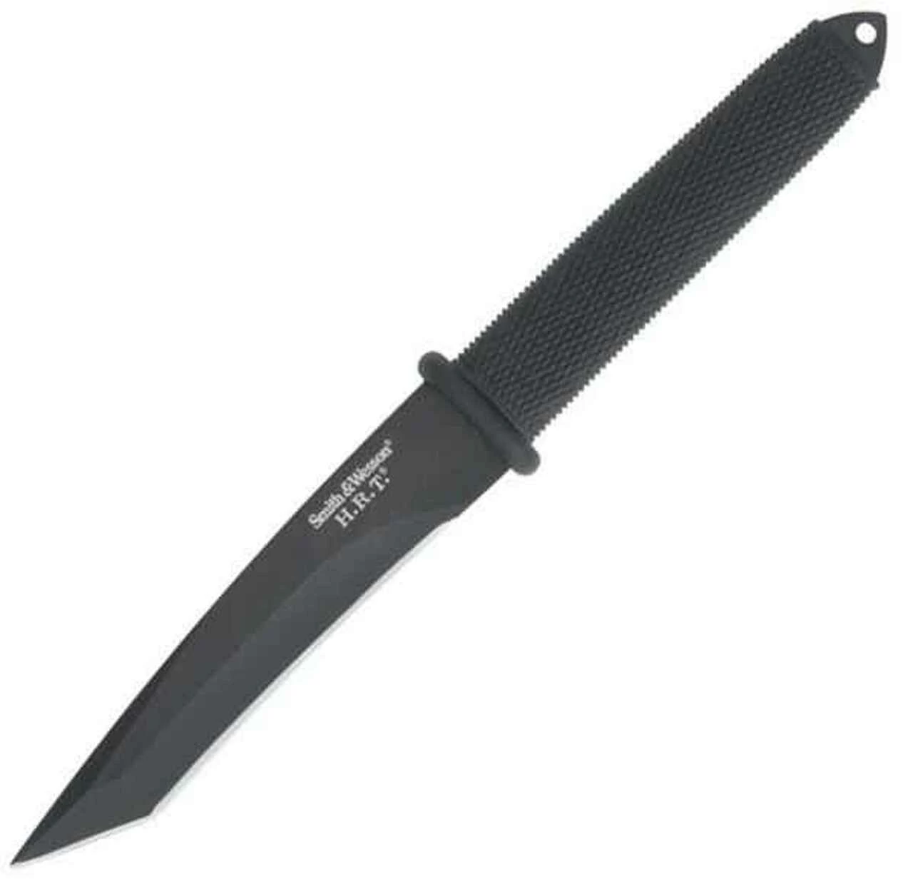 Smith &Wesson Tanto Boot Knife. 9 1/8″ overall. 4 3/4″ black powder coated tanto blade. Black rubberized handle. Lanyard hole. Black leather boot clip sheath.