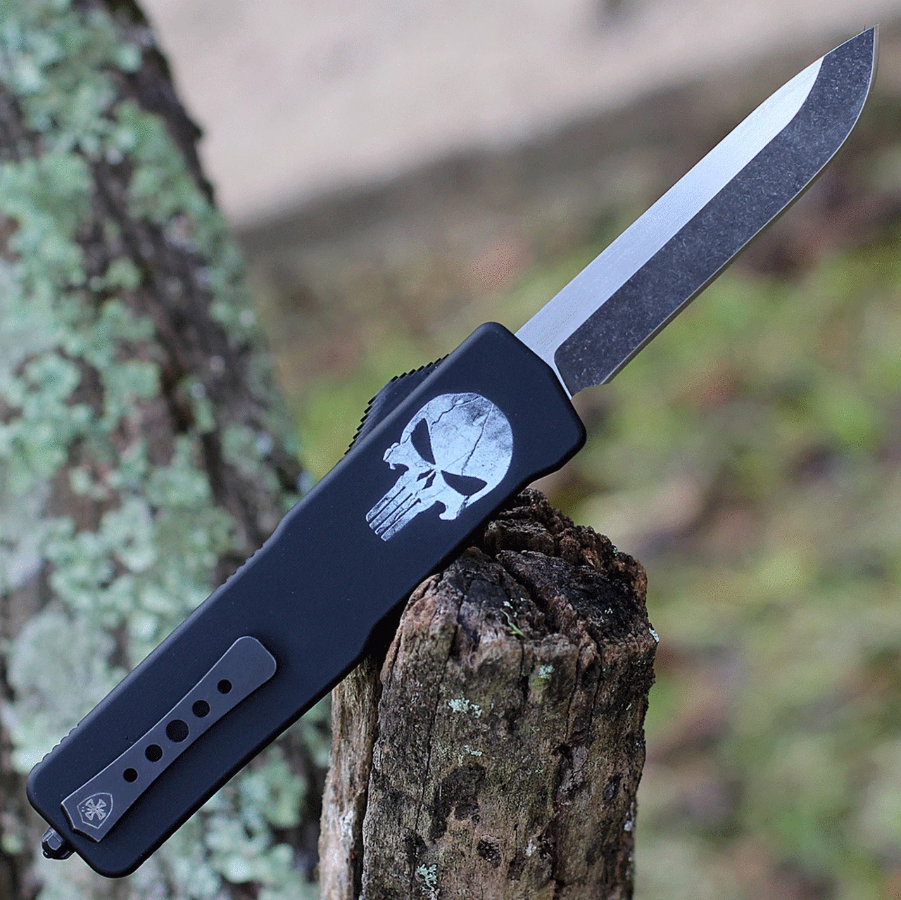 Templar Knife Premium Lightweight Series – Large OTF Automatic (LA-FL-32-1) – 3.55″ Powder D2 Black SW Drop Point, Aluminum Fallen Skull Handle