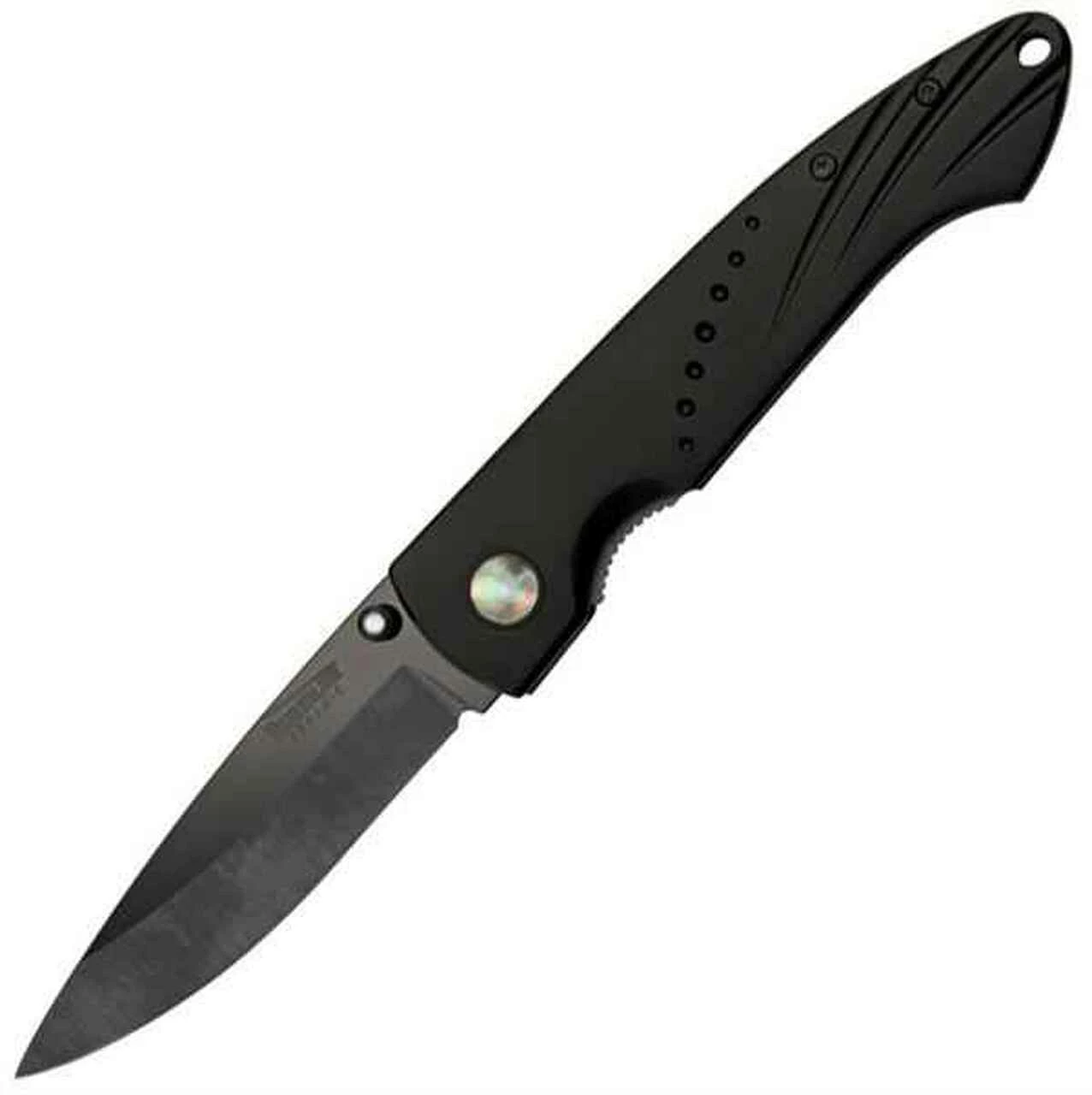 Timberline Linerlock. 4 1/2″ Closed, Black Ceramic Blade w/Mother-of-pearl Inlaid Dual Thumb Stud, Black Aluminum Handles