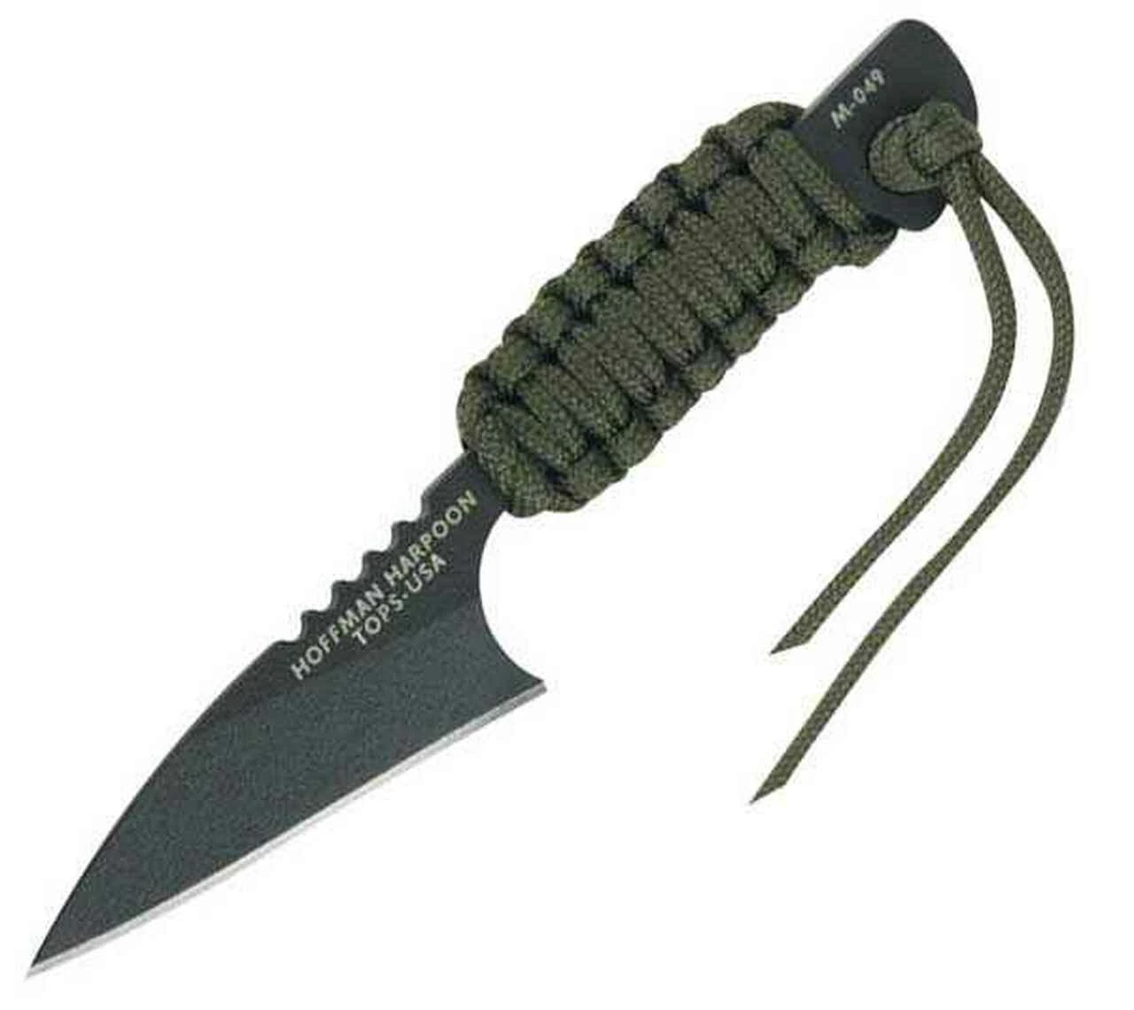 Tops Hoffman Harpoon Mini. One piece 1095 high carbon steel construction with black traction coating. OD green cord wrapped handle. Leather neck sheath. Lanyard.