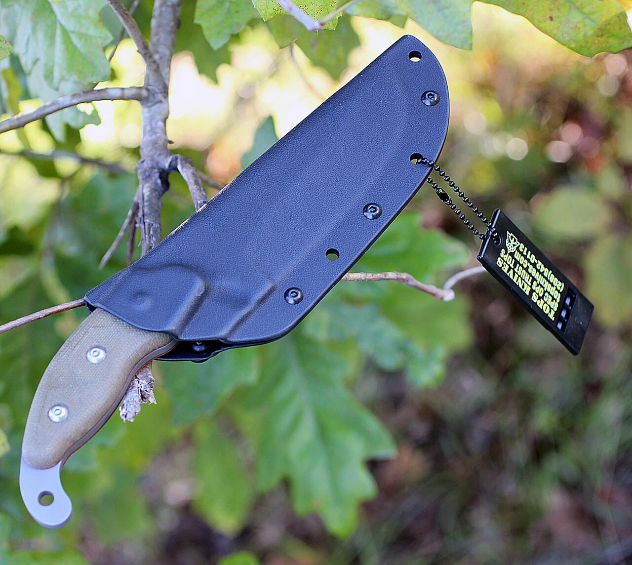 The Wind Runner XL Snake River Edition is a re-worked version of a classic TOPS hunting knife. This new version sports our famous Black River Wash with green canvas Micarta handles to provide grip even when they’re wet. This is the larger of the two Wind Runners and it is a great all-around hunting knife. Every detail about the blade was included to make processing animals easy. The subdued tip allows the user to skin without worrying about puncturing a hide. The recurve and sweeping belly are ideal slashing tasks for gutting, skinning, and caping. The high grind on the thick stock make it strong, but with a very sharp edge. The handle is comfortable in standard hunting grips and the green canvas Micarta will help the user keep that grip even when it’s wet (a must when processing game). The Kydex sheath provides excellent retention and a low-profile carry option.