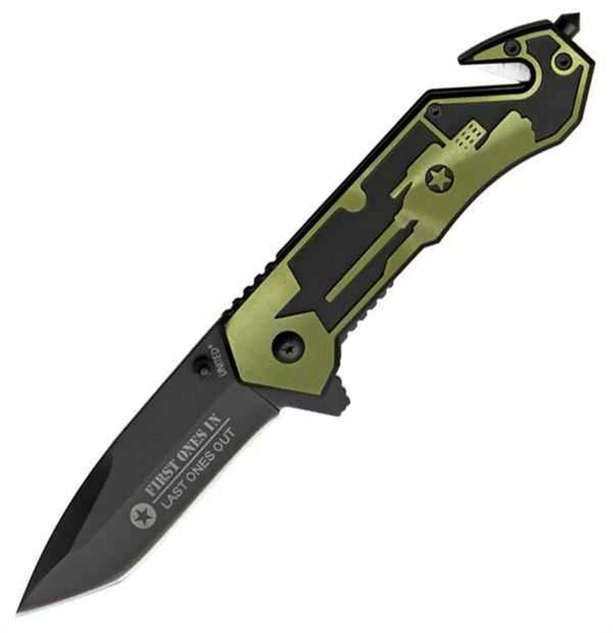 United Assisted Opening Folder. First Ones In. 4 3/4″ closed framelock. 3 3/8″ AUS-6 stainless black coated tanto blade etched “First Ones In, Last Ones Out.” Thumb stud. Black aluminum handles with integrated seat belt cutter and glass breaker. Green anodized cutout tank design on handle. Black stainless pocket clip. Powered by multiple Blackie Collins patents.