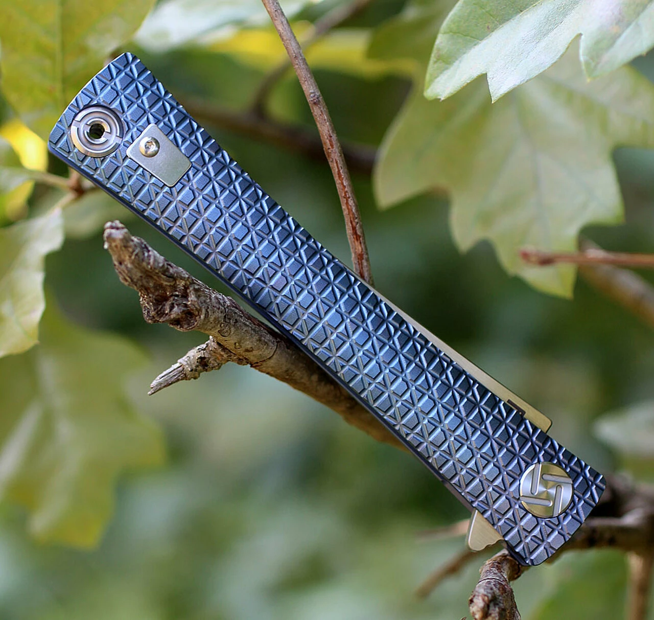 Artisan ATZ1805GBUM S Waistline, 4″ M390 Plain Blade, Blue Titanium Handle