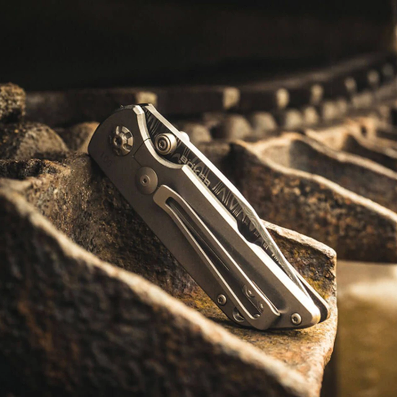 Boker worked with the Americans in Wartime Museum in Virginia to create a unique “Ladder” pattern Damascus blade. This blade is hand forged by Chad Nichols with various materials from the production of M4 Sherman tanks that were previously restored by the museum. Paired with a solid steel frame lock with Hinderer LockBar Stabilizer and contoured jute Micarta handle scale, this knife is a true collector’s piece with a storied history.