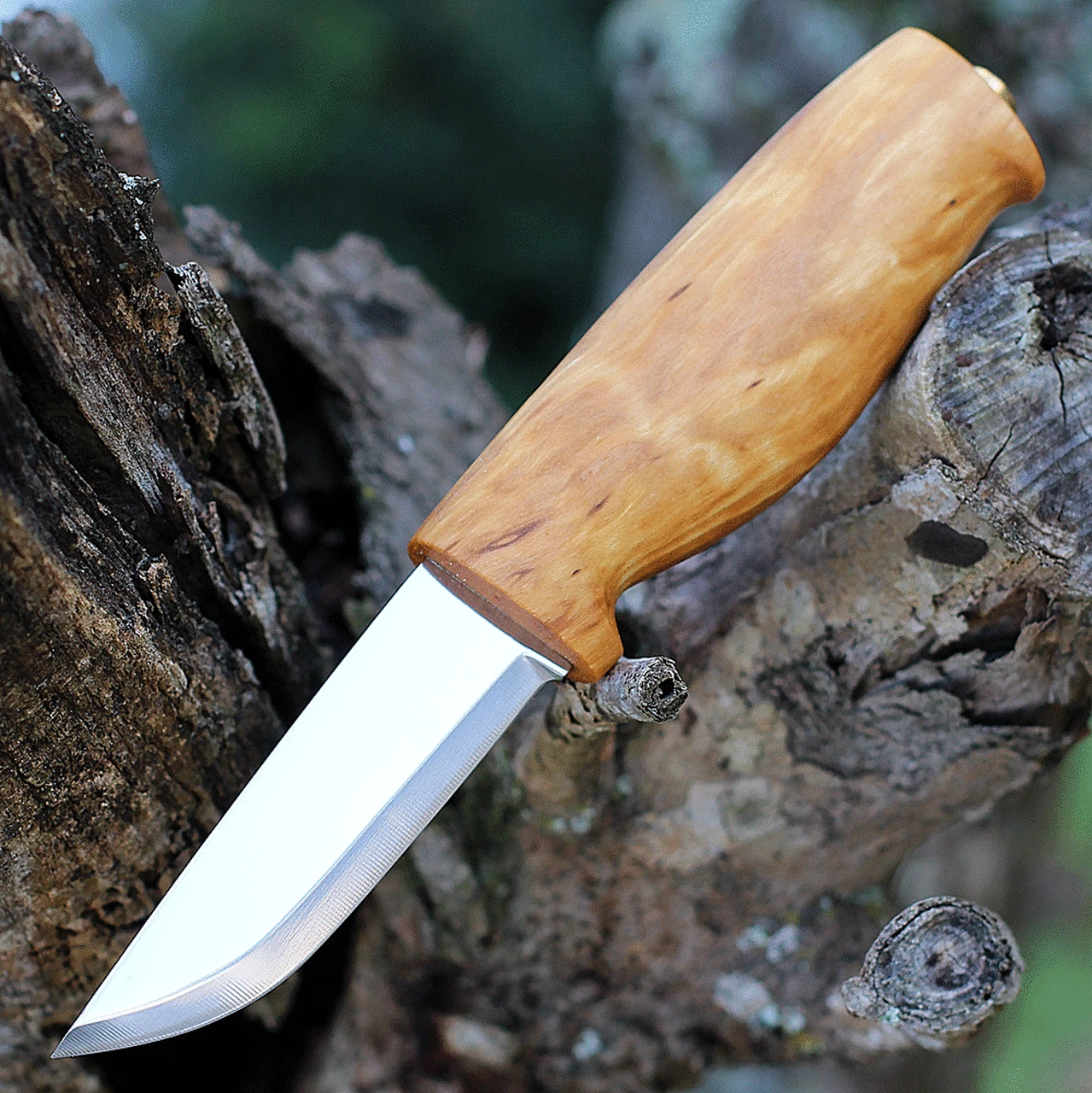 It has a blade made of non-laminated stainless steel (Sandvik 12C27). With its curly birch handle and a straight forward leather sheath this is an every mans knife for every day chores.