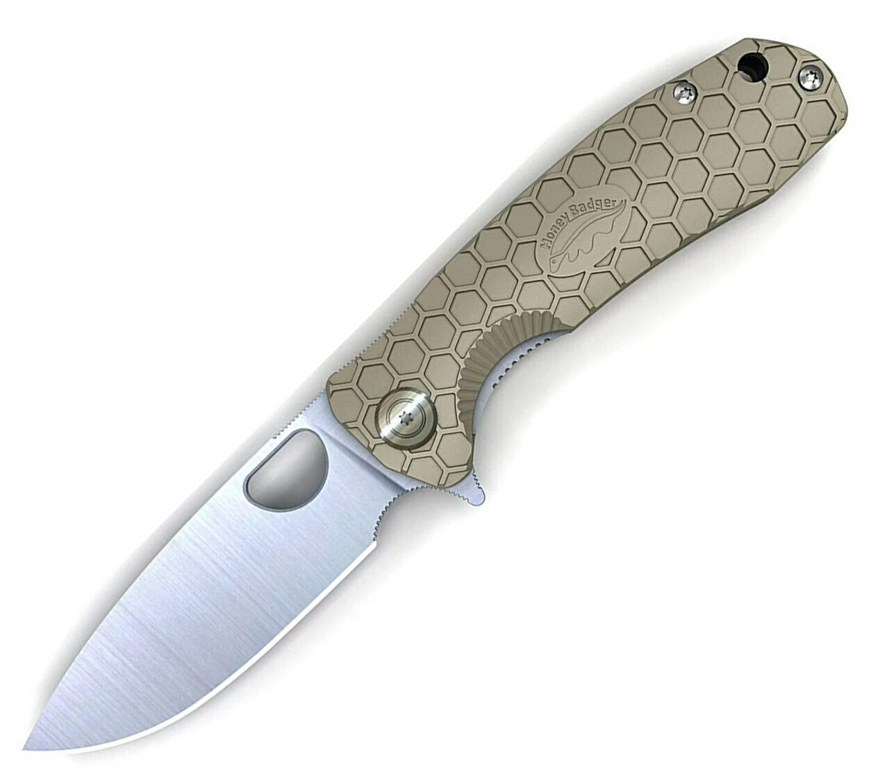 Honey Badger Knives Medium Flipper HB1012, 3.19″ 8Cr13MoV Satin Drop Point Plain Blade, Tan FRN Handle
