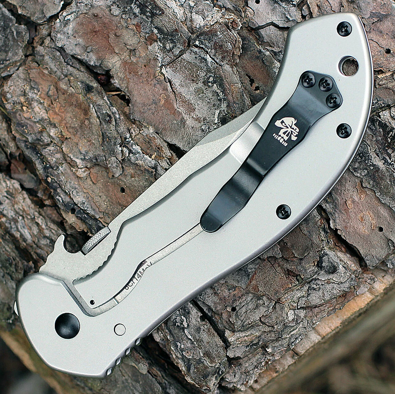 The CQC-10K features a bowie-style blade of 8Cr13MoV stainless steel with a stonewashed finish. It holds an edge well, and then resharpens easily when out in the field. The handle has a deep curve, designed to fit the palm and reduce hand fatigue during time-consuming tasks. For a secure-grip, the CQC-10K has a G-10 front scale with a stainless steel back and sturdy frame lock. Of course, it’s also equipped with the Emerson “wave shaped opening feature” so that the folder can be opened as it is withdrawn from the pocket. Or use the thumb disk for simple, manual opening.