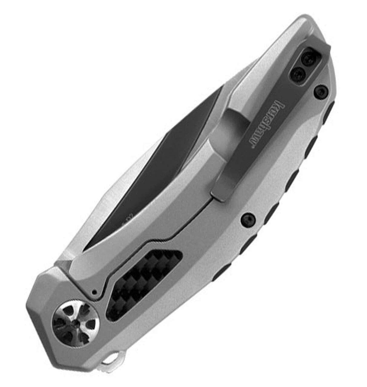 Inspired by the lines of aerospace design, the Norad has landed. The Norad opens with Kershaw’s KVT ball-bearing system and a flipper. But we reduced the size of the flipper when the knife is closed—and made it disappear altogether when the knife is open. Carbon fiber inserts in the steel handle and an oversized, polished pivot add a modern look, while a custom backspacer with raised jimping provides a secure grip. The big, beefy drop-point blade has a two-toned finish: a hollow in the blade features gray PVD coating and the rest of the blade is machine satin finished.
