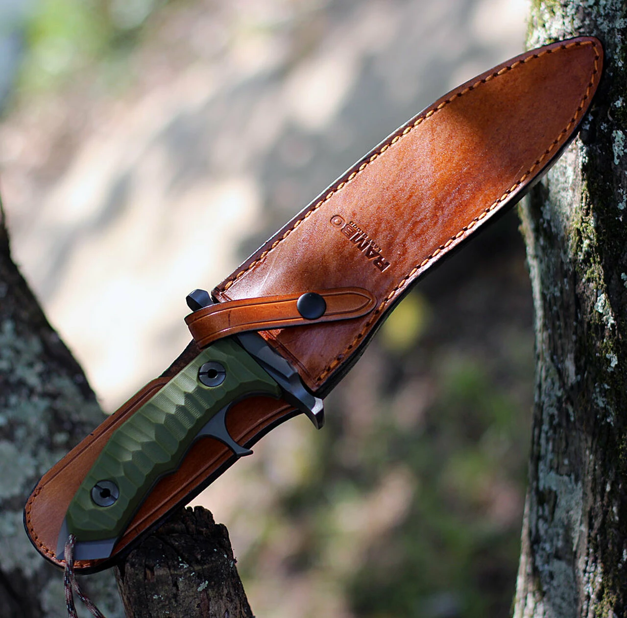 This limited edition Rambo: Last Blood Heartstopper knife is an amazing piece of movie memorabilia. Few props from any movie are as iconic as John Rambo’s knives, and now, you can make one yours. This licensed replica was made by meticulous measuring of the actual knife used in Rambo: Last Blood, and has been crafted to exact standards, including the buffalo leather sheath with leg tie and camo paracord lanyard.