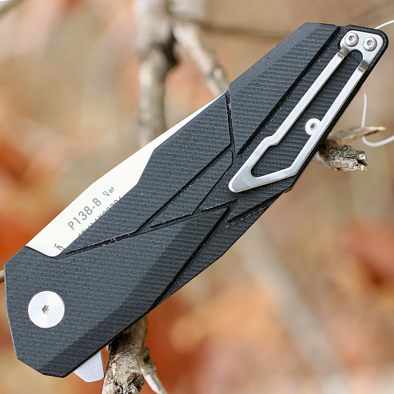 P138-B/P138-W is a practical cutting tool owing to its robust tanto blade. Made of 14C28N stainless steel in fine polish, and shaped to an optimal tanto style, the blade features razor sharpness and fairly strong tip. The built-in thrust roller bearing pivot secures quick blade deployment once you get the flipper down. In addition to the liner lock, a back safety lock reinforces while wielding the knife in working. The G10 handle is ergonomically grooved to be skid-proof for comfortable holding and performs well regardless of harsh environments.